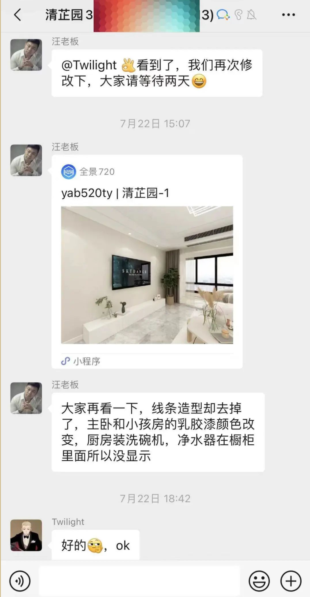 業(yè)主一家人從今年3月份開始了解澳華,期間換了一次房,終于在7月中旬,他們一家人決定選擇澳華裝修他們的新家。