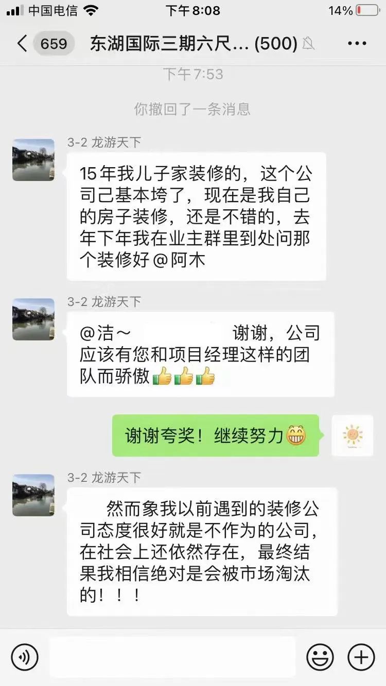 3月14日下午,復地東湖三期的業(yè)主王先生,往澳華裝飾的業(yè)主服務群轉發(fā)了一條鏈接,并熱情祝賀!原來,澳華裝飾被湖北省市場監(jiān)管局評為“湖北省放心消費創(chuàng)建示范單位”。隨后,業(yè)主王先生又往小區(qū)的500人業(yè)主群轉發(fā)了這條消息。
