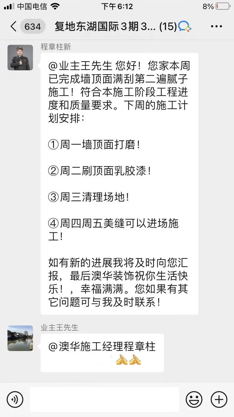 因為有過一套房子的裝修經(jīng)驗,業(yè)主王先生自己便是半個裝修專家,對設計細節(jié)、施工工藝、材料品質(zhì)、服務過程有非常嚴格的要求。為了讓客戶放心,設計師及交付團隊,實時在微信群眾進行進度播報,讓業(yè)主及時了解每一項施工過程及細節(jié)。