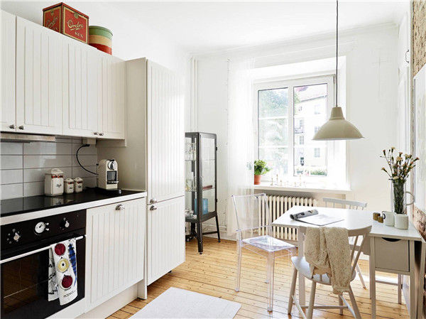 很多老房都是廚房跨陽臺的設計,廚房面積比較大,雖然是長條形,安放一張小餐桌也并不是什么難題。