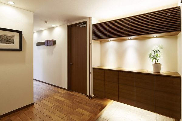 玄關(guān)需要均勻的環(huán)境光,玄關(guān)鏡應(yīng)設(shè)置燈帶,避免陰影和色差。最后,鞋柜應(yīng)懸空,底部空間作為鞋子的臨時放置處,并且設(shè)置燈帶補充照明。