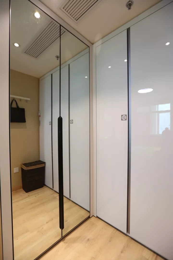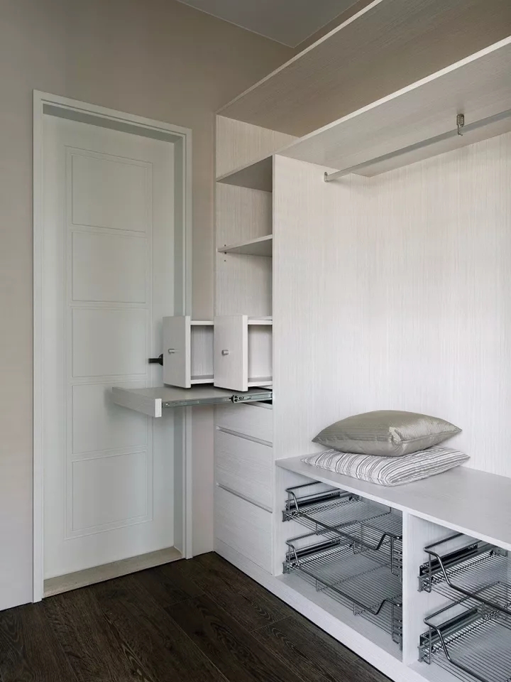 衣帽間應以需求習慣和衣物種類做規劃配置,如果是獨立式衣帽間,可采取開放式設計,不做獨立門,可安裝嵌入式鏡面衣柜,方便更衣,衣柜內增加收納層板,增加收納量還能避免開放式層板可能造成的凌亂感。