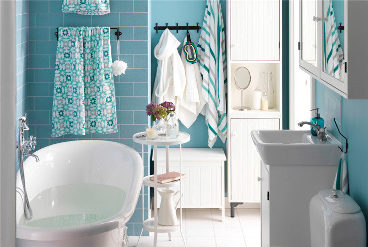 海水藍的空間,帶來清新涼爽的感覺,最適合武漢這大熱天了!利用掛桿將毛巾、浴巾、衣物等分類擺放,剩下地方放一個小浴缸,頂級奢華配置,小空間學習的典范!