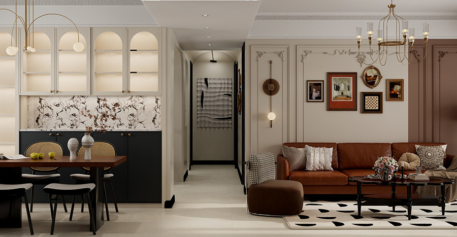 餐廳燈具需要體現(xiàn)出溫馨感。無(wú)主燈不僅能全面照明,還能對(duì)局部進(jìn)行重點(diǎn)突出,讓食物看上去更有食欲。建議燈光色溫選擇2700K-3000K左右。