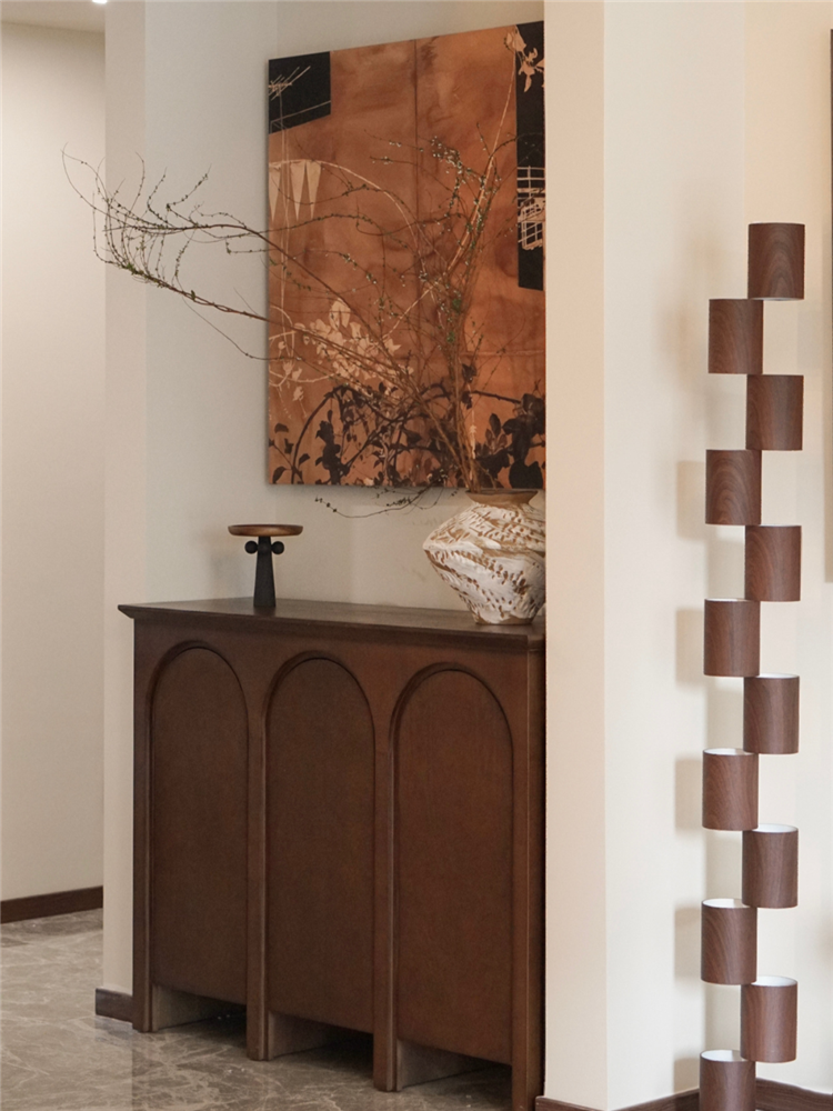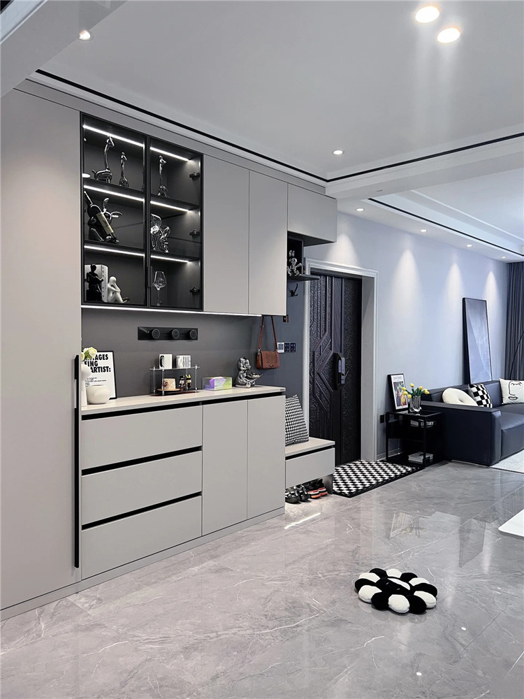 比如開門就是客餐廳,且公區面積較大的戶型,可以嘗試在入戶門平行的地方定制一組玄關柜,這樣就解決了入戶收納問題,也不影響整體通透性與美觀性。