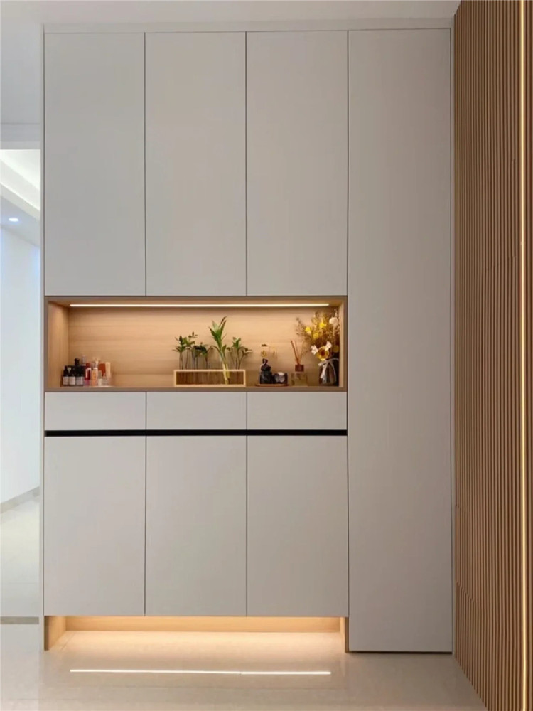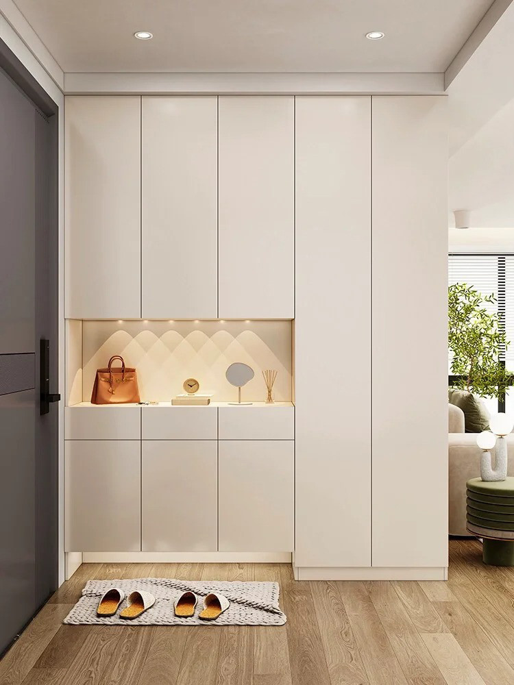 這類入戶門一側通常有一面墻,可直接沿著墻體結構定制一組鞋柜,滿足入戶收納需求。