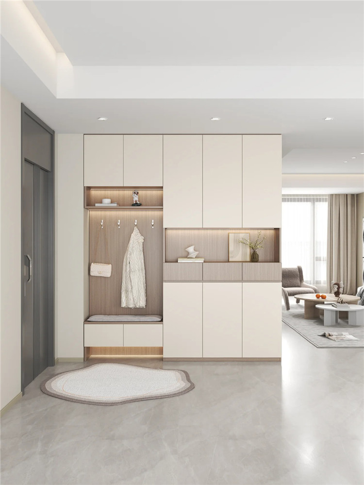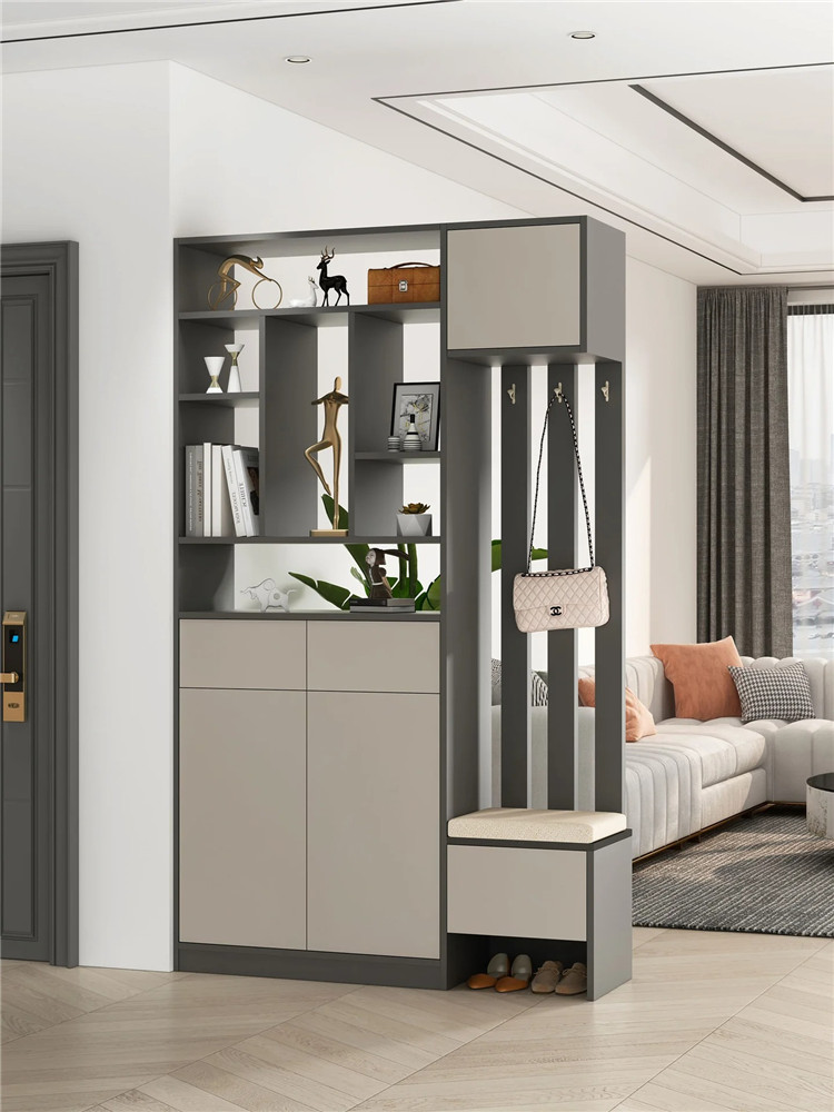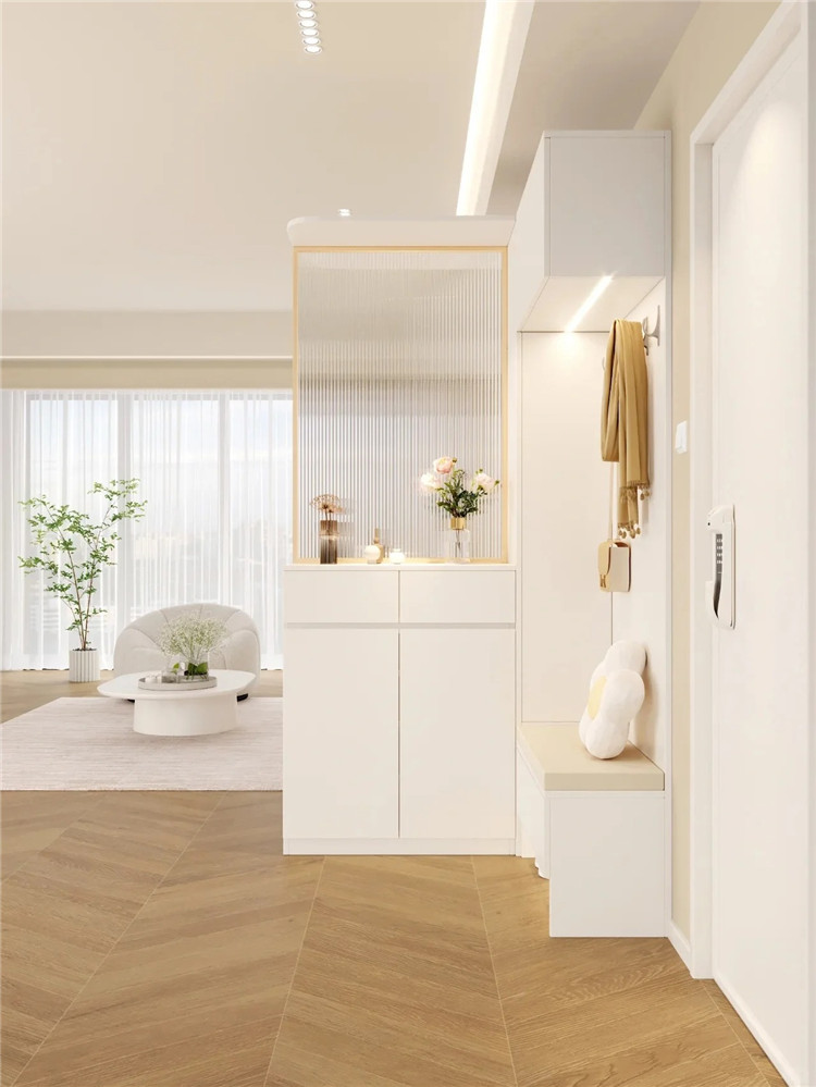 為充分利用有限空間,可直接定制鞋柜來充當隔斷,尤其是一體式的組合設計,可讓整體空間顯得更加和諧、美觀,給日常生活帶來極大的便利。