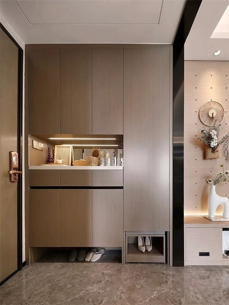 如玄關與餐廳相連,還可將玄關柜銜接餐邊柜,一體化設計功能更齊全,整體更整潔美觀。