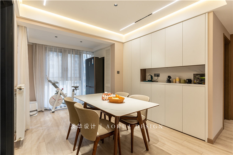 在【曙光星城】這個項目中,通過在陽臺處定制儲物柜,將冰箱完美嵌入,也讓餐邊柜有了更多收納空間。