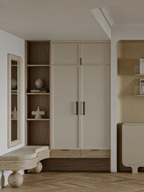 一進(jìn)門的玄關(guān)處做成懸浮設(shè)計(jì),視覺(jué)上會(huì)更輕巧美觀。既保證了入室的收納能力,又不會(huì)像整面柜體一樣造成強(qiáng)烈的壓抑感。
