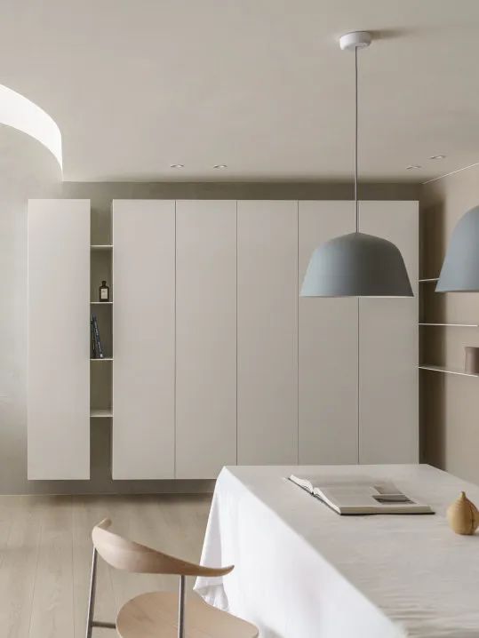 餐廳空間區(qū)域普遍較小,但是對(duì)收納要求又很高,懸浮式餐邊柜所占空間比例少,能夠最大程度減少壓迫感。頂部做通頂造型,又能增加整體的收納效果。