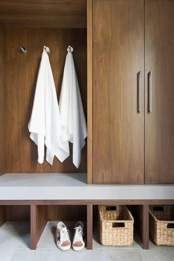 玄關加入卡座,不僅便于在進出門時輕松完成換鞋過程,尤其是對于有老人或者孩子的家庭,安全便捷,同時也增加了門廳空間的儲物功能。而鞋柜和卡座的款式裝飾與材料質感,要與整體協調統一,保持視覺上的整潔。