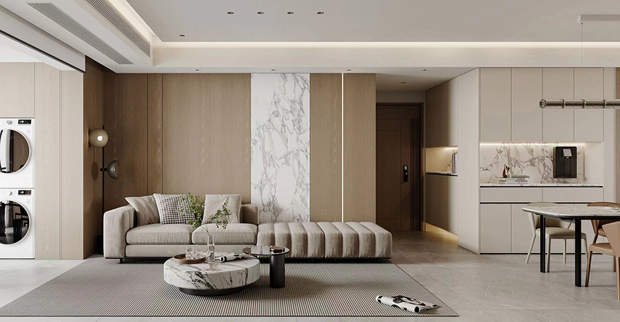 案例簡介:本案例的主人公追求高品質生活,希望能夠在結束忙碌工作之后盡情感受生活的美好,也因此在家裝設計上更追求舒適感與品質感。而由于平常過來一起閑聊的朋友比較多,因此業主還與設計師強調希望能夠將休憩空間與活動空間進行一定隔斷,以提升自己與家人生活的私密性。基于此,設計師為業主選擇了相對經典耐看而又高級的現代輕奢風,同時借助功能空間的合理劃分進行動靜分離,提升生活品質。