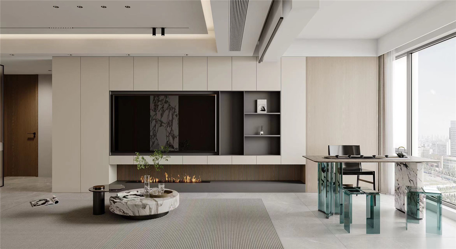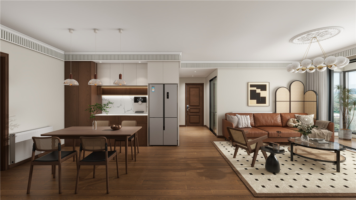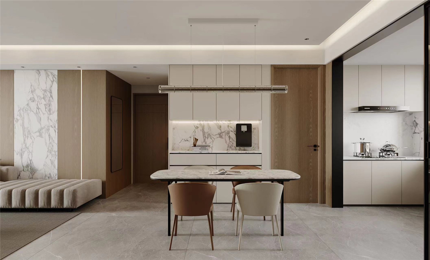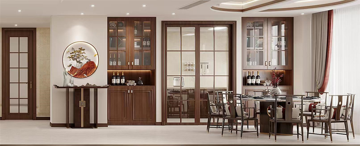就餐區域被設計在客廳區域的延長處,有效提升空間利用率。鏤空深木色櫥柜簡約而又不失自然風情。