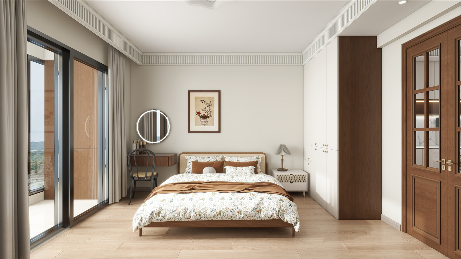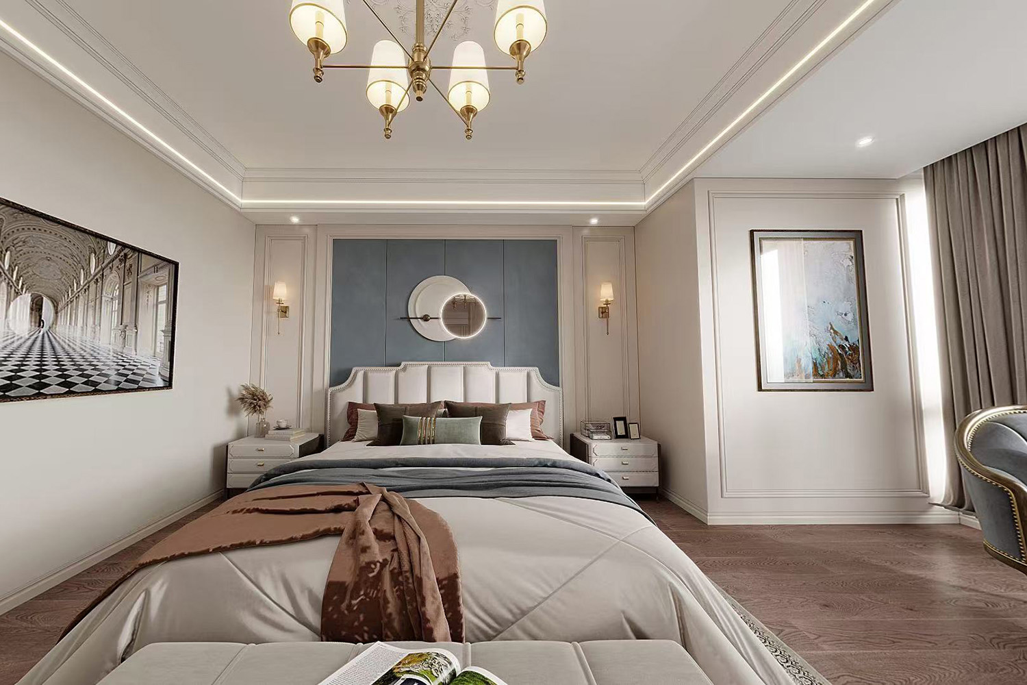 臥室沿用了與整個房屋一致的元素,通過各類線條的走向、家具的造型處理營造一種典雅高貴的大氣美。