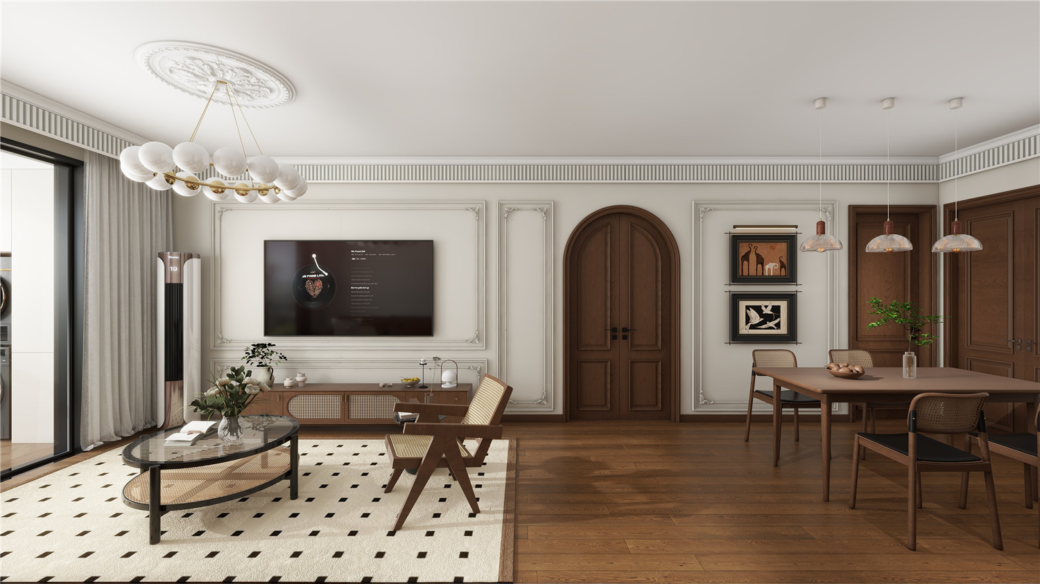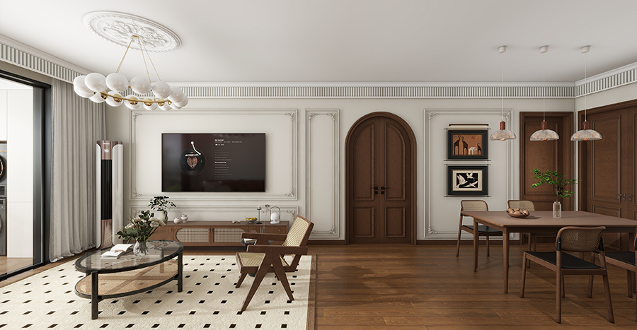 帶有暗紋處理的壁紙搭配上菱形紋理地板,奠定了精致的格調氛圍。而桌椅、吊燈等細節設計,則為空間增添藝術時尚氣息。