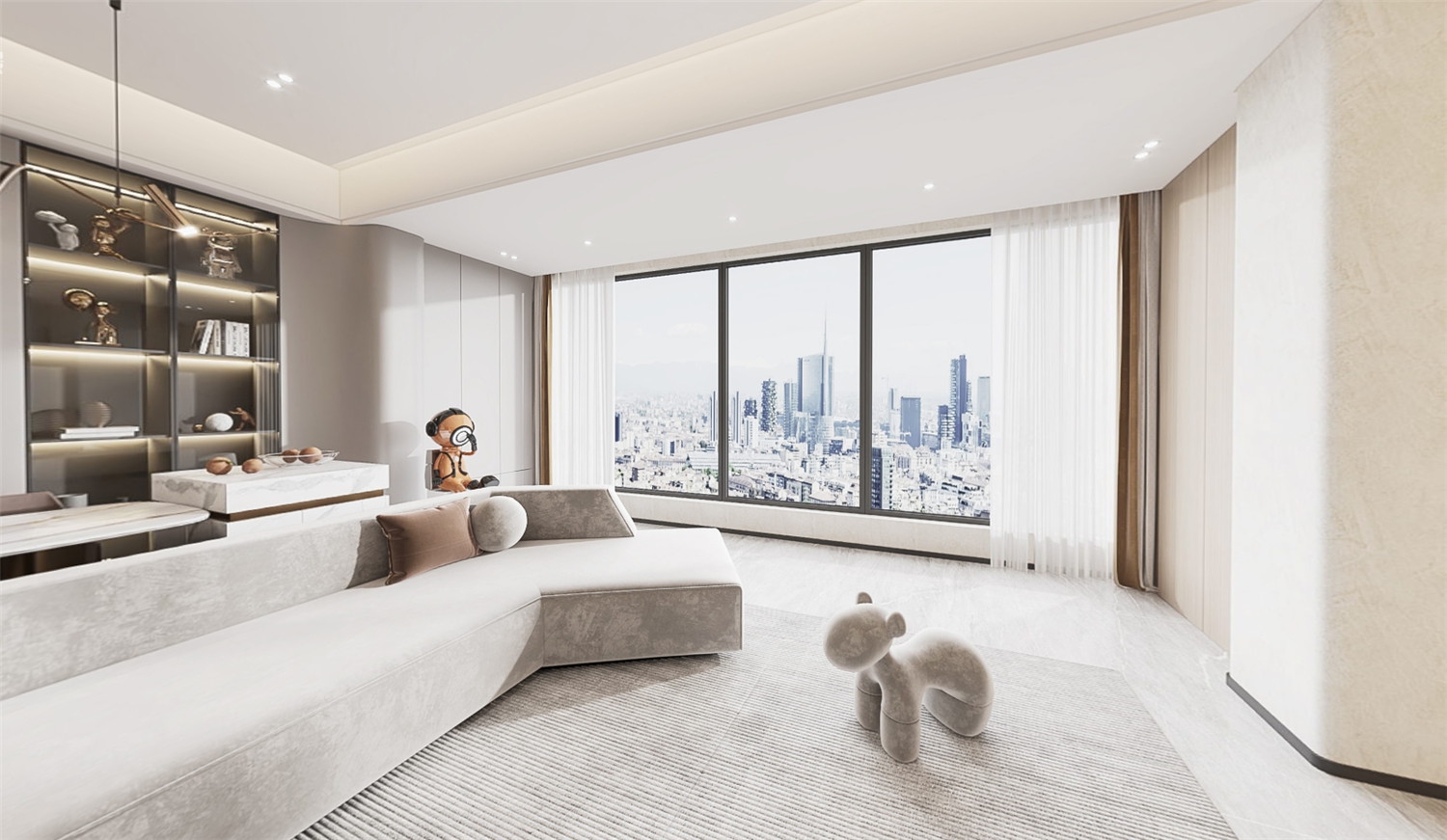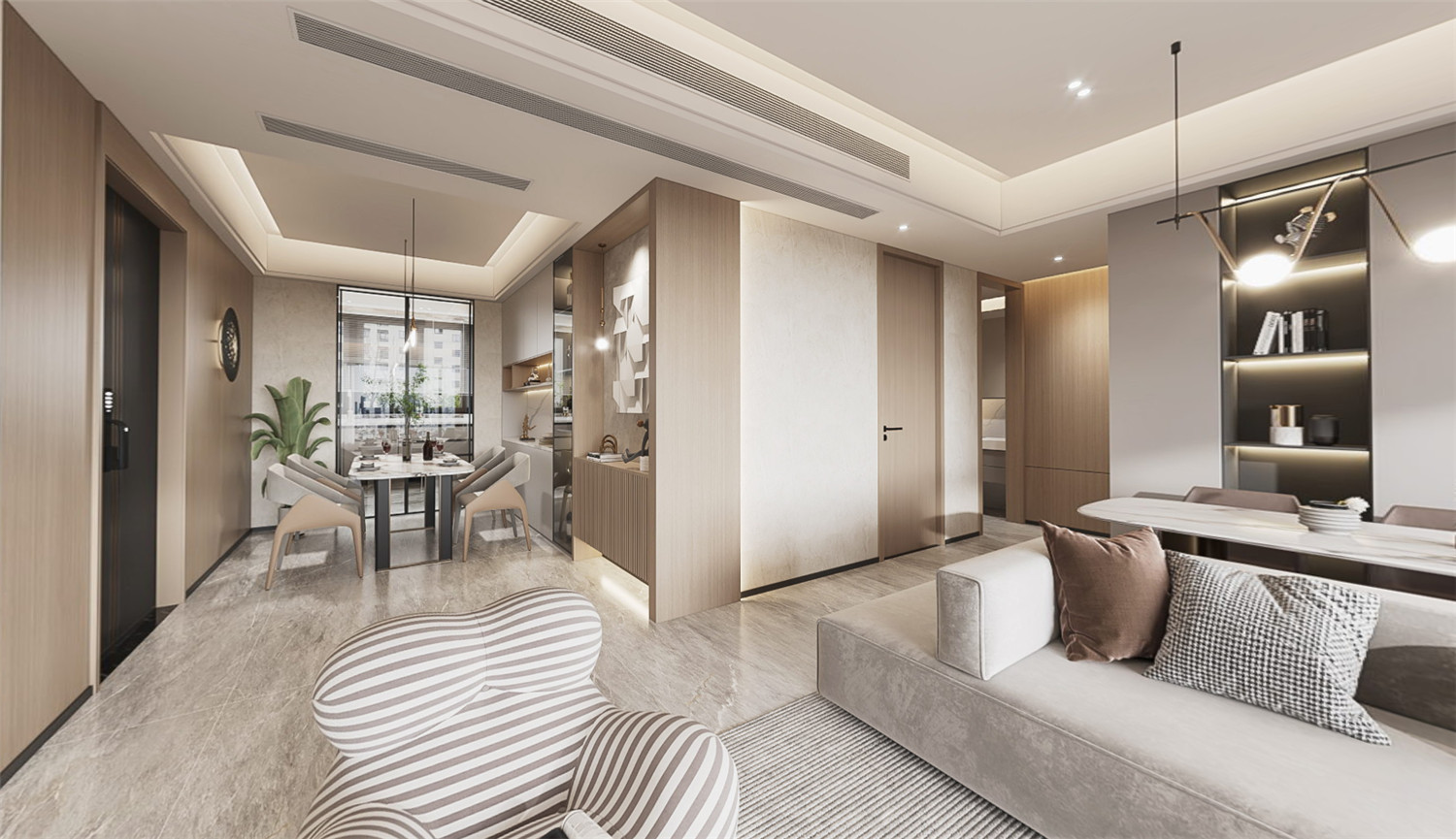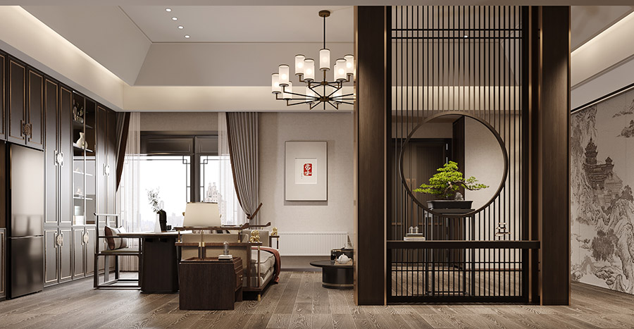 復(fù)地東湖國際這套170㎡的四居室住宅戶型相對比較平整方正,而由于入戶門在房屋偏角處,因此設(shè)計師在進行規(guī)劃設(shè)計時就利用入戶門軸向作一個劃分,將作伴區(qū)域作為業(yè)主的辦公、休憩區(qū)域、中間則設(shè)置為會客區(qū)域,右邊則打造為兒童房,有效提升了各個功能區(qū)域的劃分。