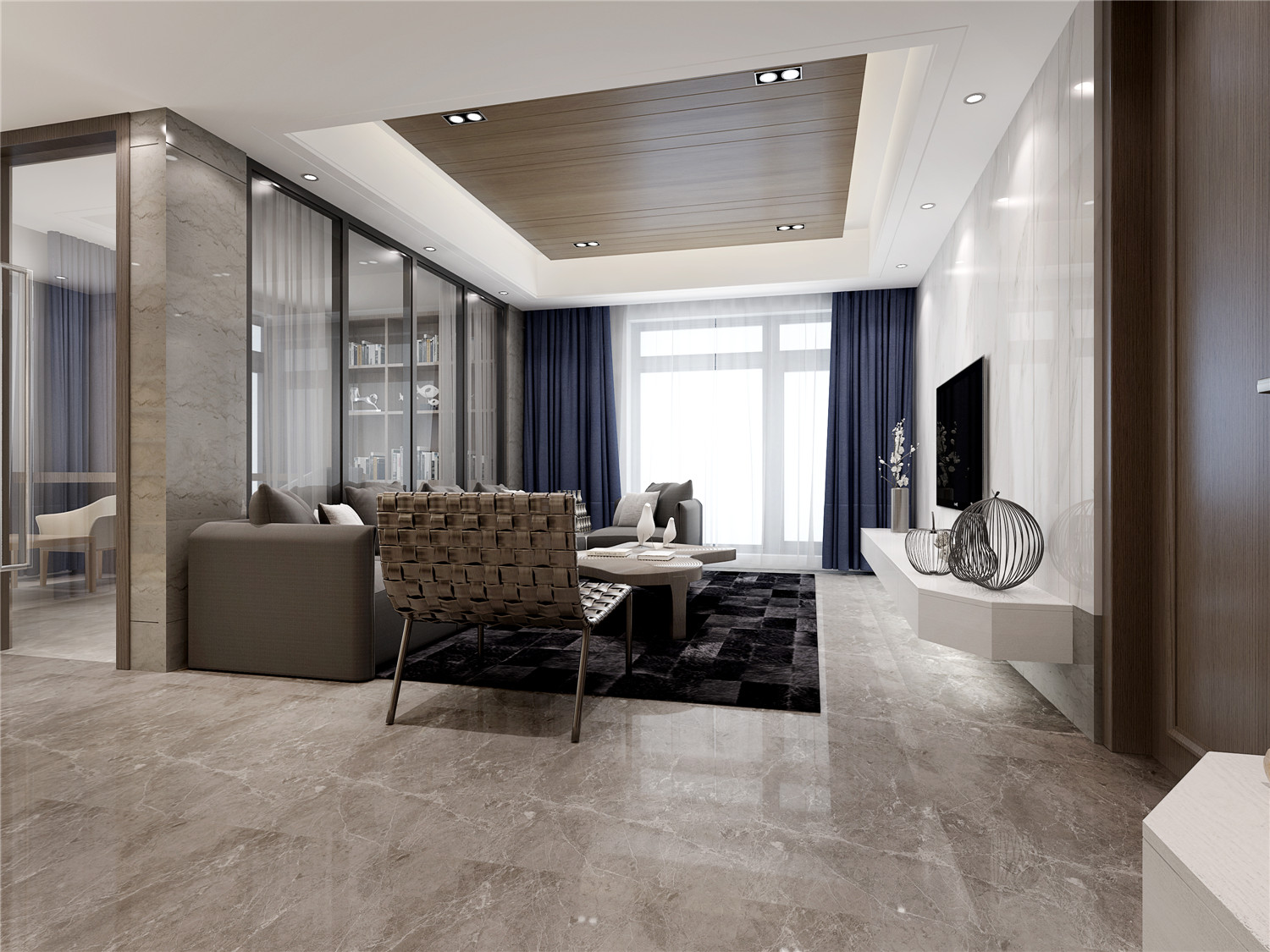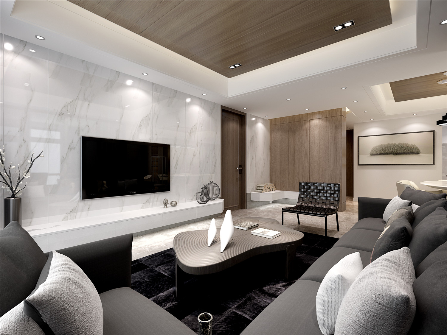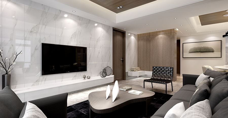 客廳區(qū)域選用了相對(duì)比較清新明麗的色彩作為主基調(diào)色,以烘托現(xiàn)代輕奢的自然典雅氣息。電視背景墻處大面積的大理石材質(zhì)與白色木質(zhì)門框相得益彰,讓簡(jiǎn)約之美展露無(wú)疑的同時(shí)更顯和諧精致。