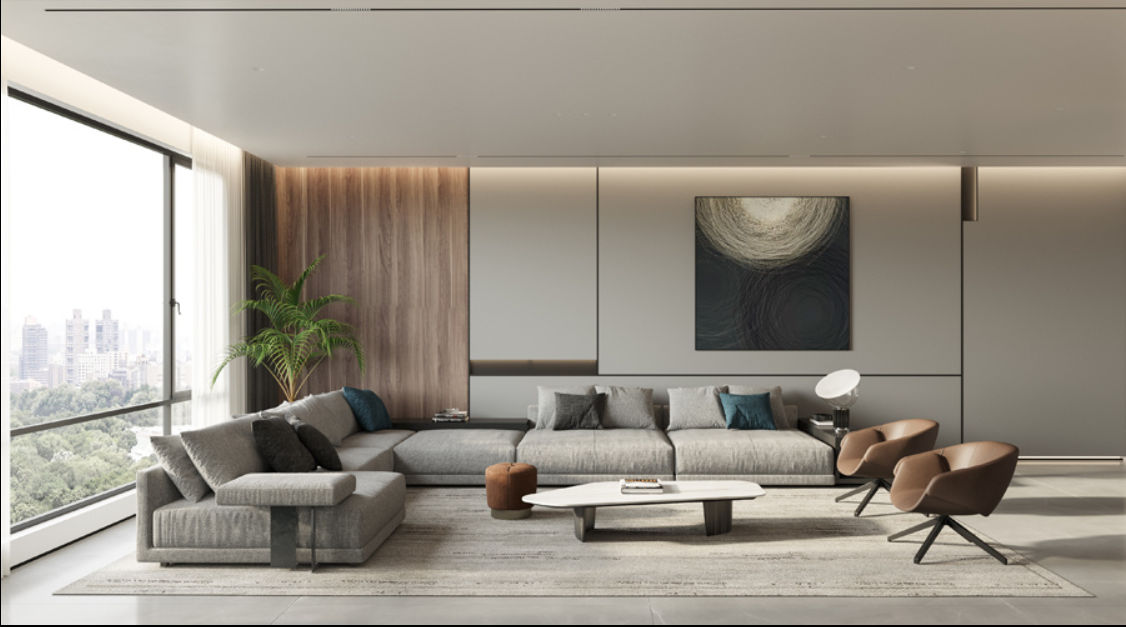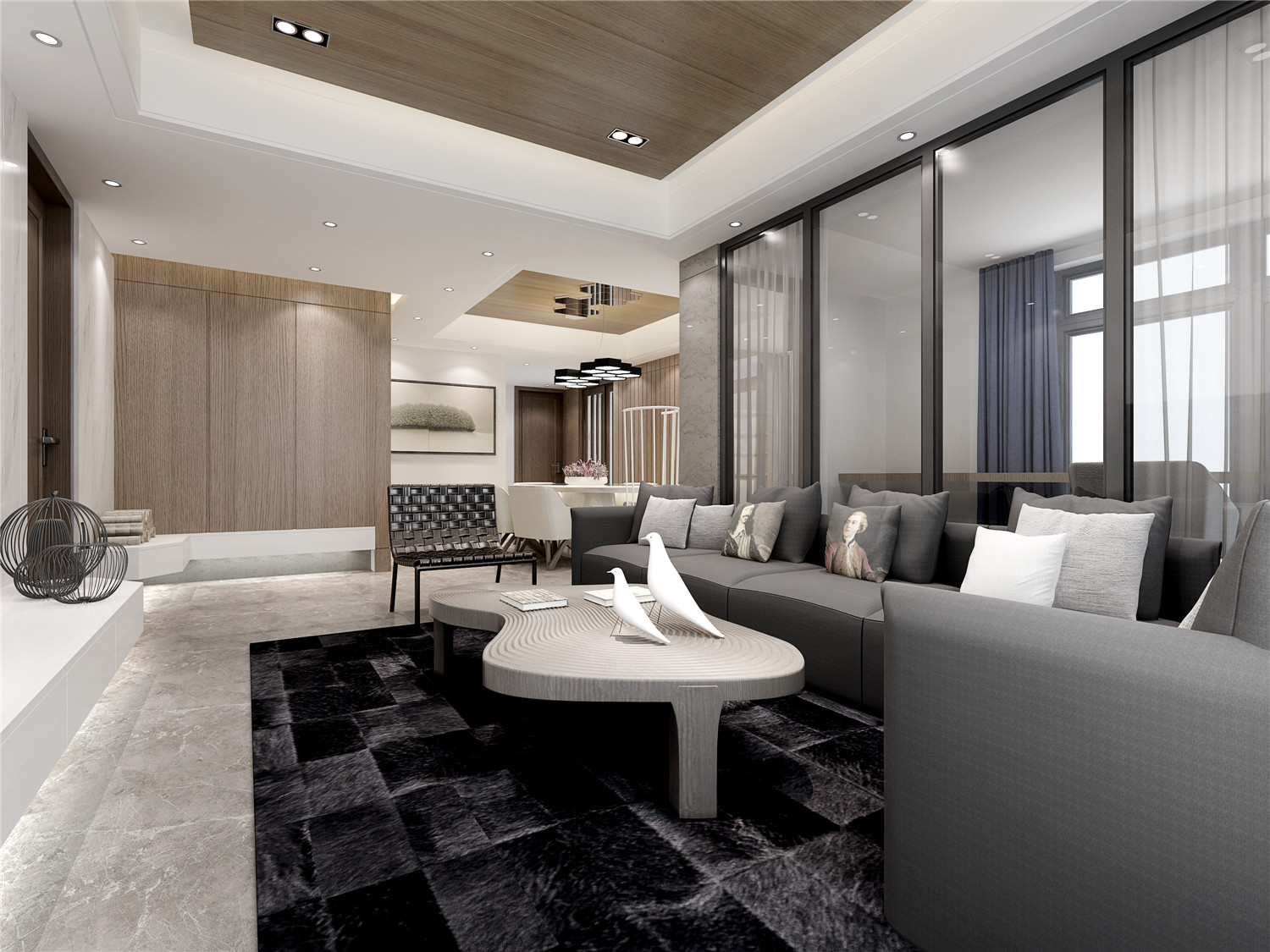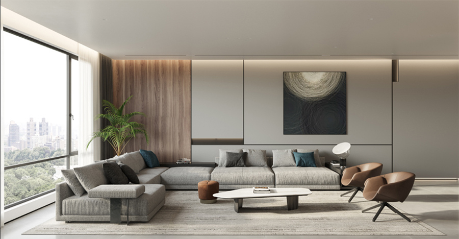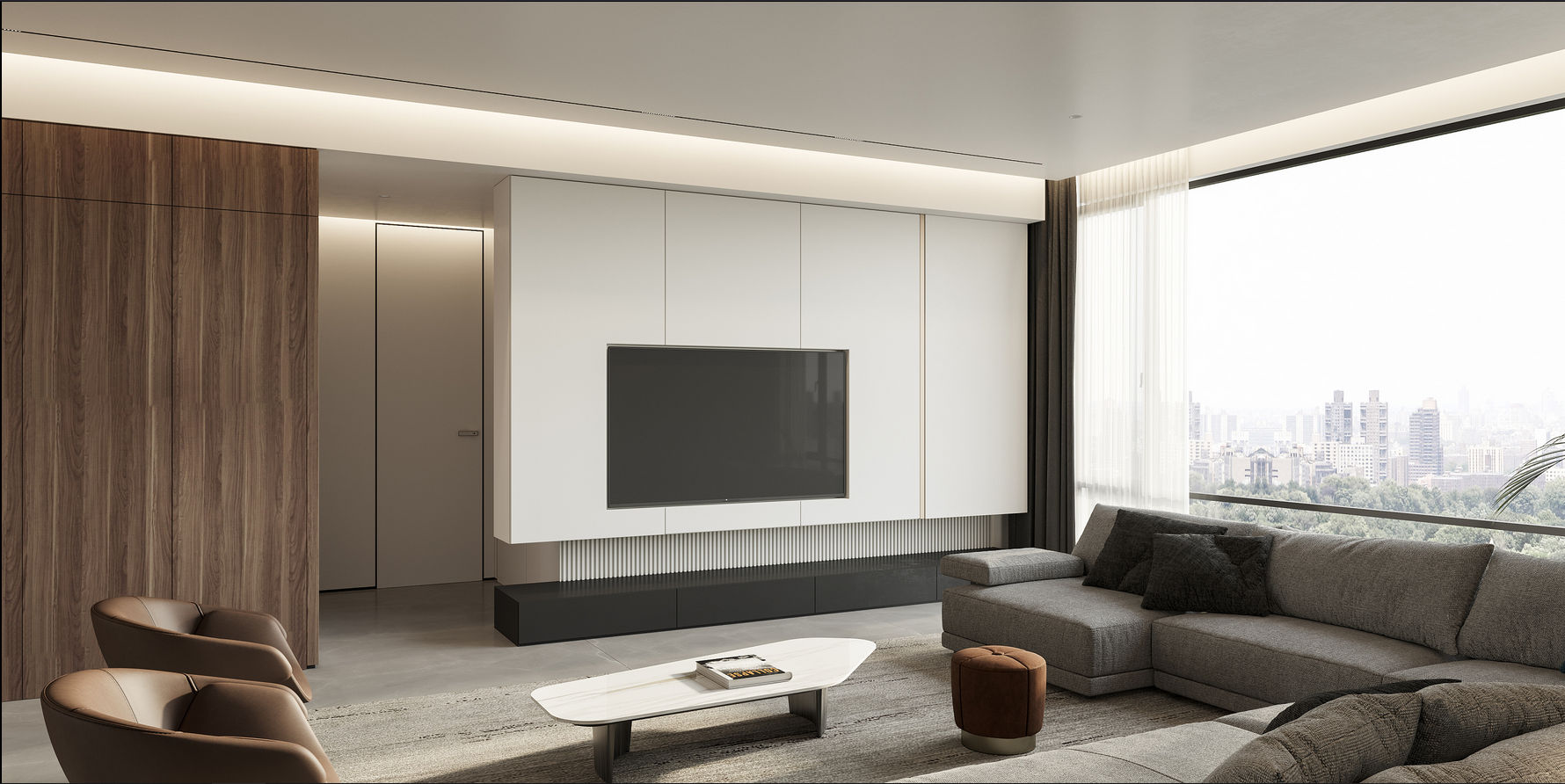 客廳區(qū)域選用了相對(duì)比較清新明麗的色彩作為主基調(diào)色,以烘托現(xiàn)代輕奢的自然典雅氣息。電視背景墻處大面積的大理石材質(zhì)與白色木質(zhì)門框相得益彰,讓簡(jiǎn)約之美展露無(wú)疑的同時(shí)更顯和諧精致。