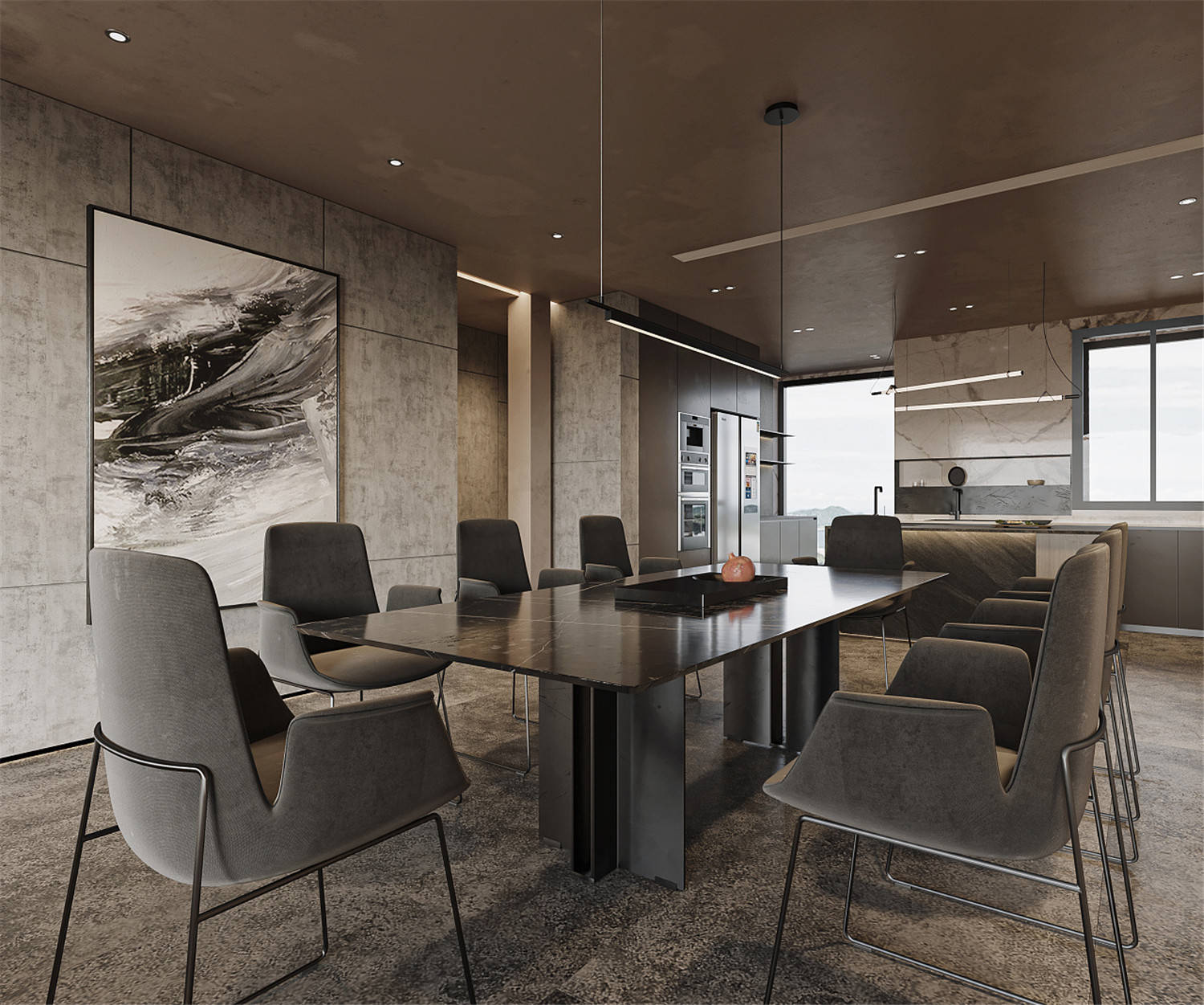 餐廳區(qū)域選用了經(jīng)典的黑白配色,大面積的白色搭配上黑色餐桌椅,營(yíng)造較強(qiáng)的視覺沖擊效果。圓形凹顯的吊頂設(shè)計(jì)搭配上低調(diào)簡(jiǎn)約的巨型吊燈,則讓輕奢的浪漫之美更好顯露。