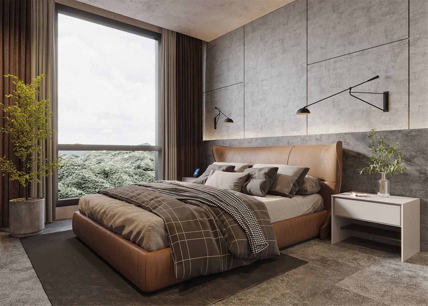 精致的浮雕設(shè)計(jì)搭配上大面積的落地窗為臥室空間籠罩上一抹淡淡的華貴美。巨型吊燈、精致的床頭燈雙燈設(shè)計(jì)則能夠滿足休憩者不同的燈光需求。