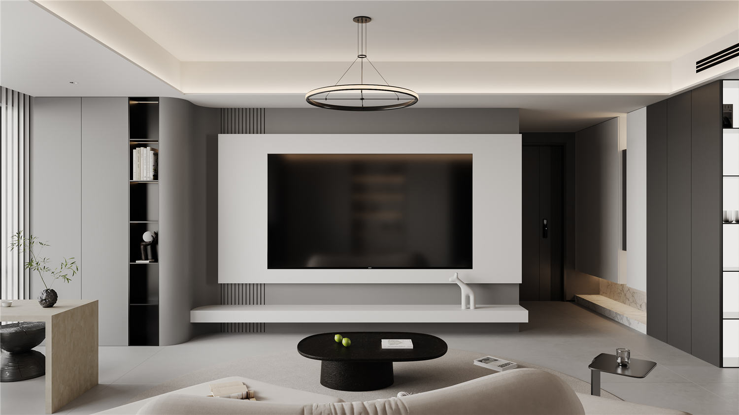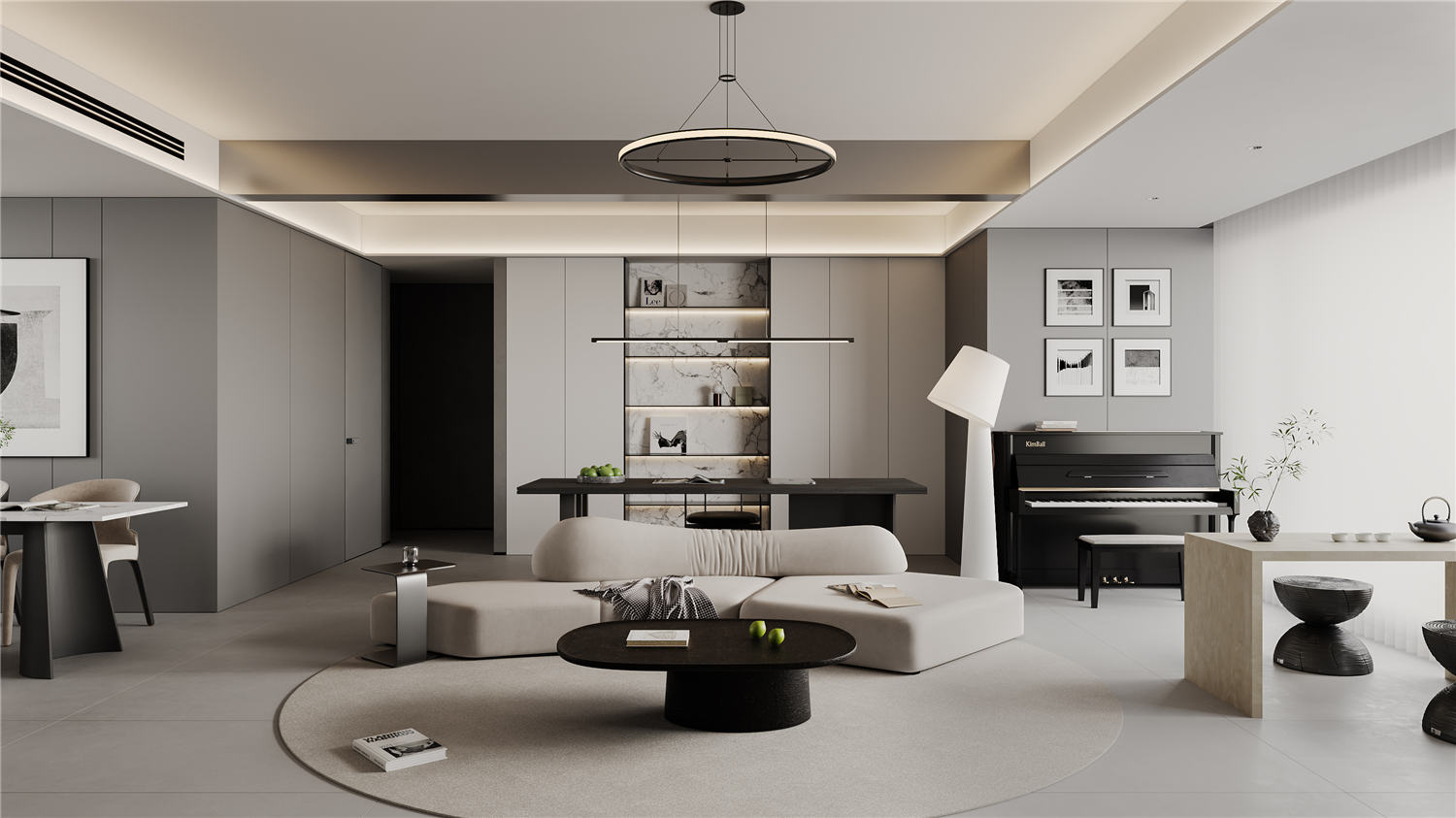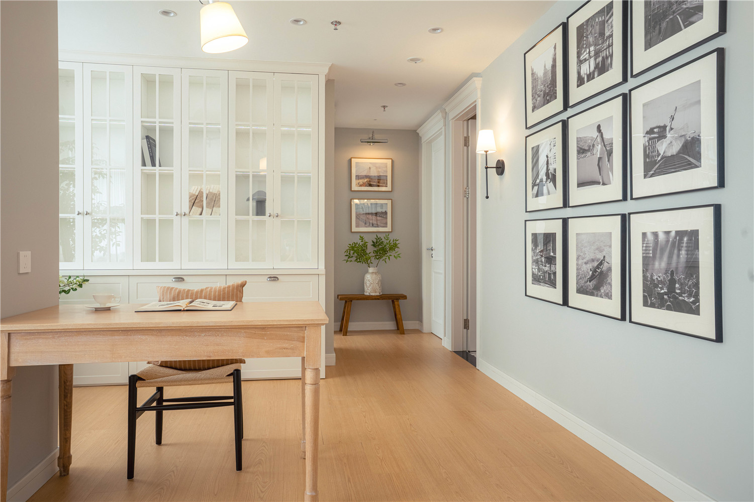 客廳區(qū)域的走廊處利用凹陷吊頂設(shè)計(jì)搭配暖黃色的圓形燈具營造一種簡約而又不失典雅的華貴美,走廊鏡頭則使用深黃色暗紋的墻紙進(jìn)行裝飾,搭配以清新油畫,讓空間區(qū)域更顯明快清新。