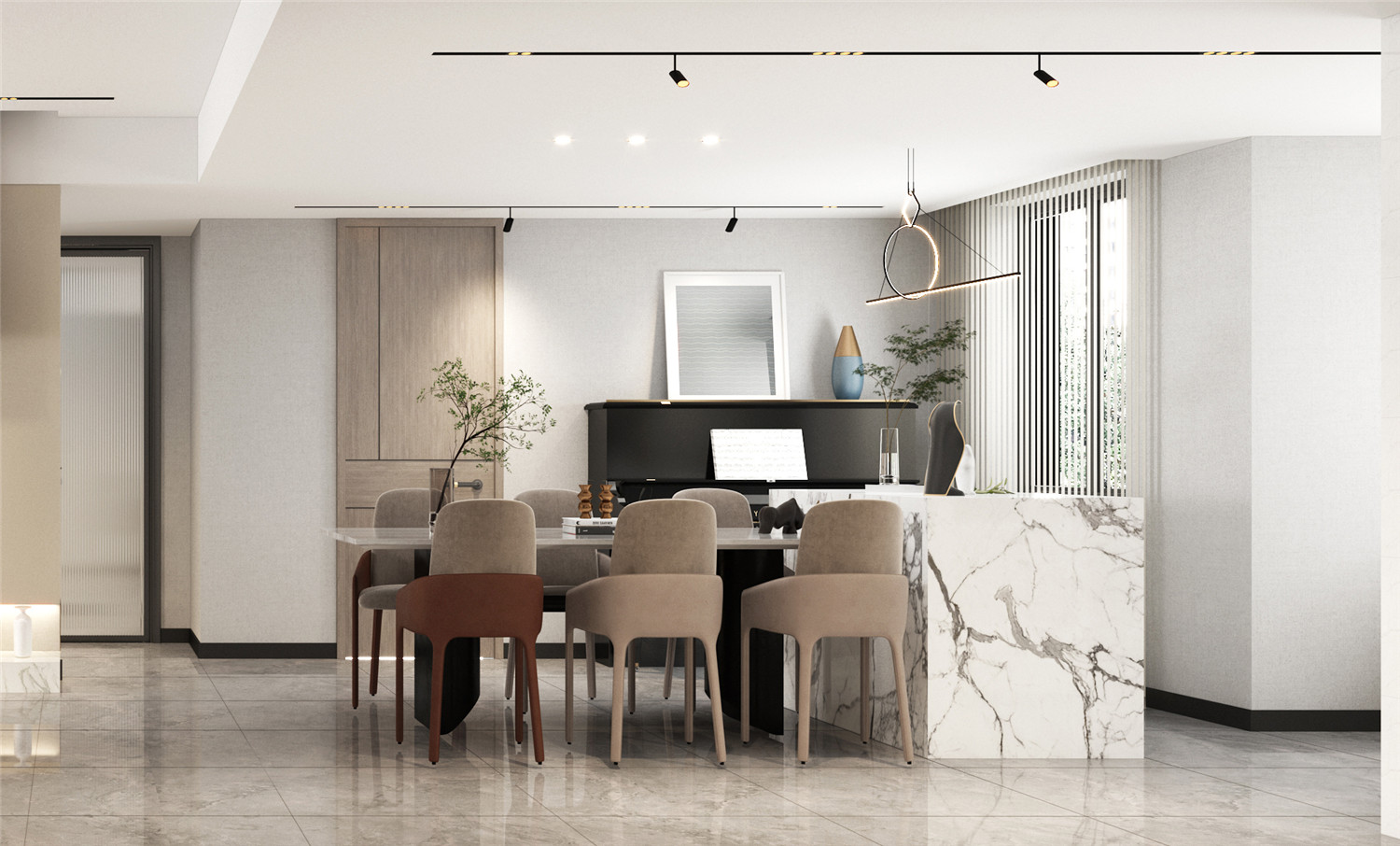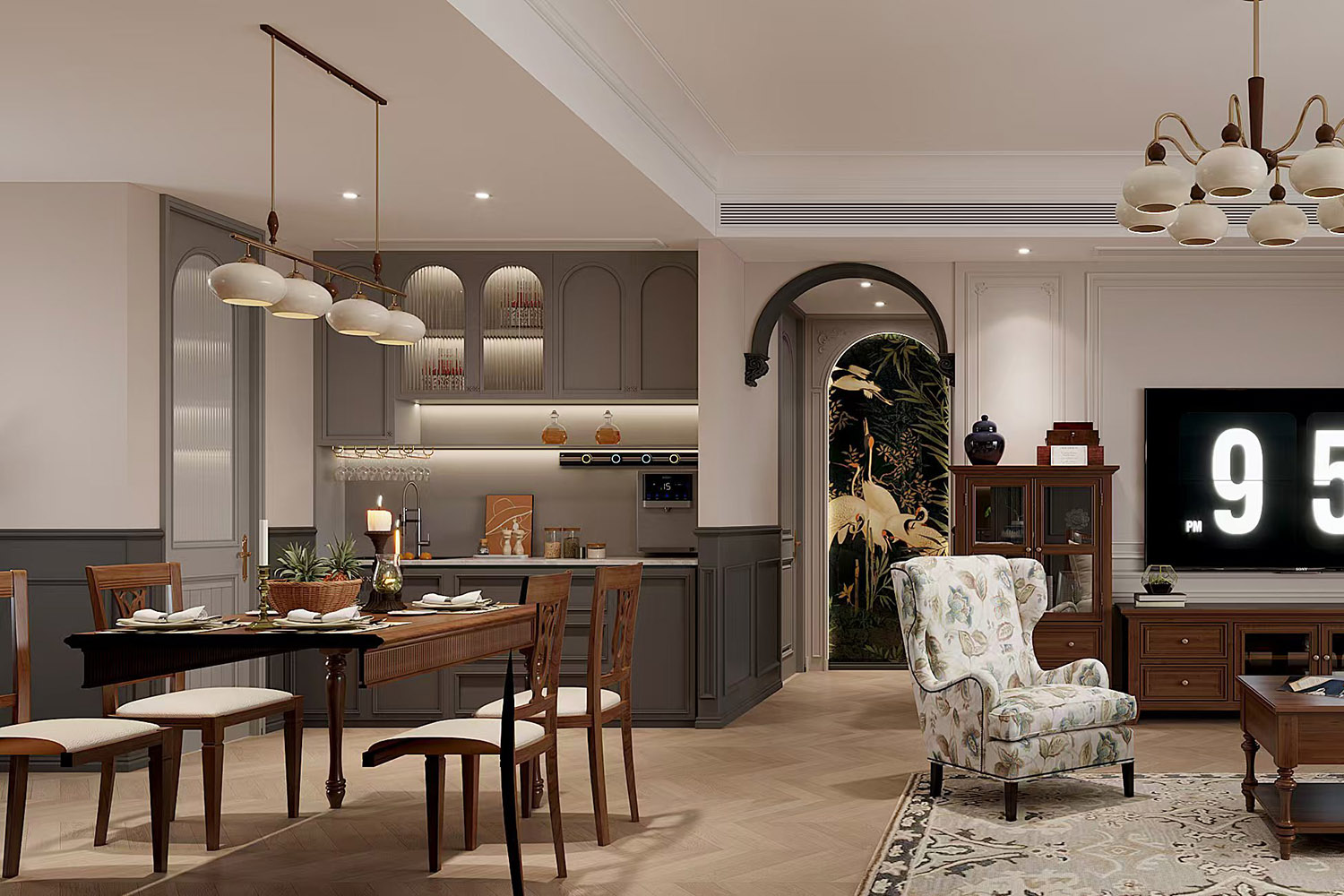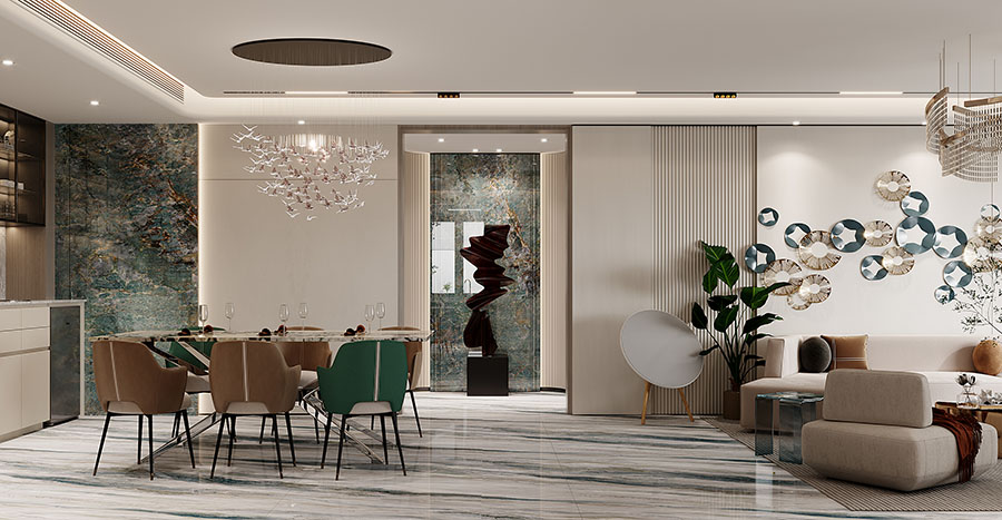 餐廳區域沿用了與客廳空間相同的配色與用材,不同的是設計感十足的吊燈與清新感十足的花鳥掛畫,讓就餐區域多了一抹溫馨靚麗氣息。
