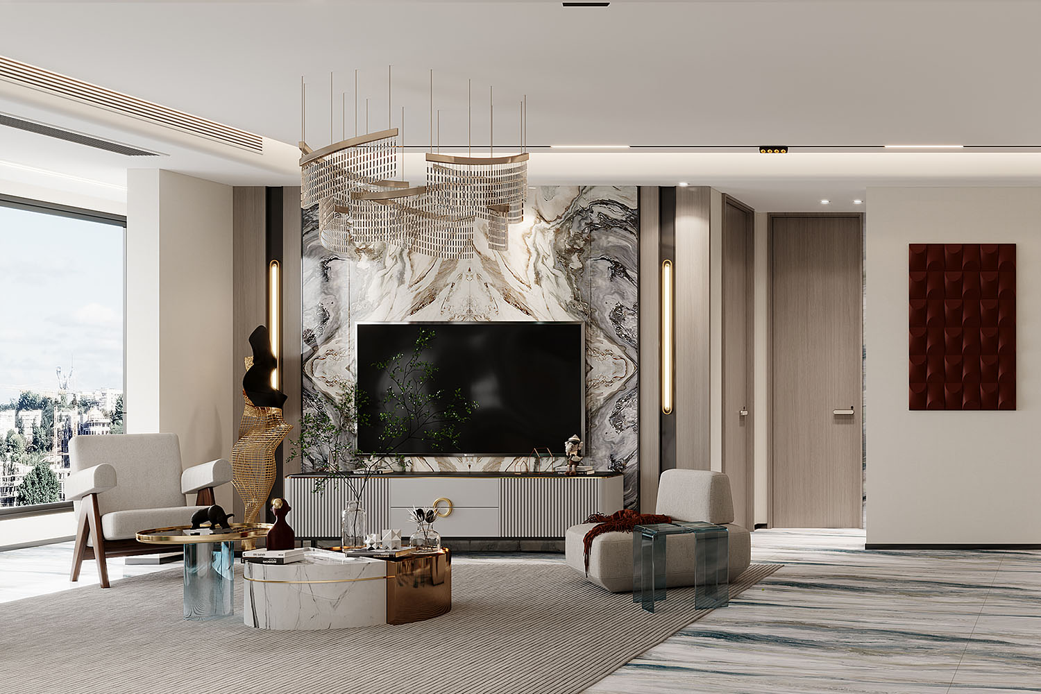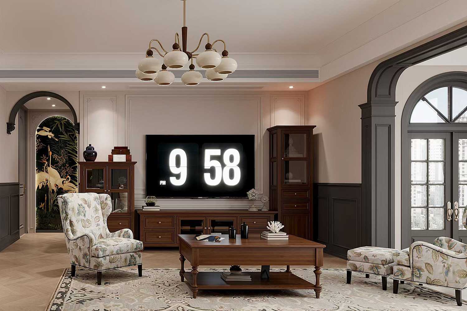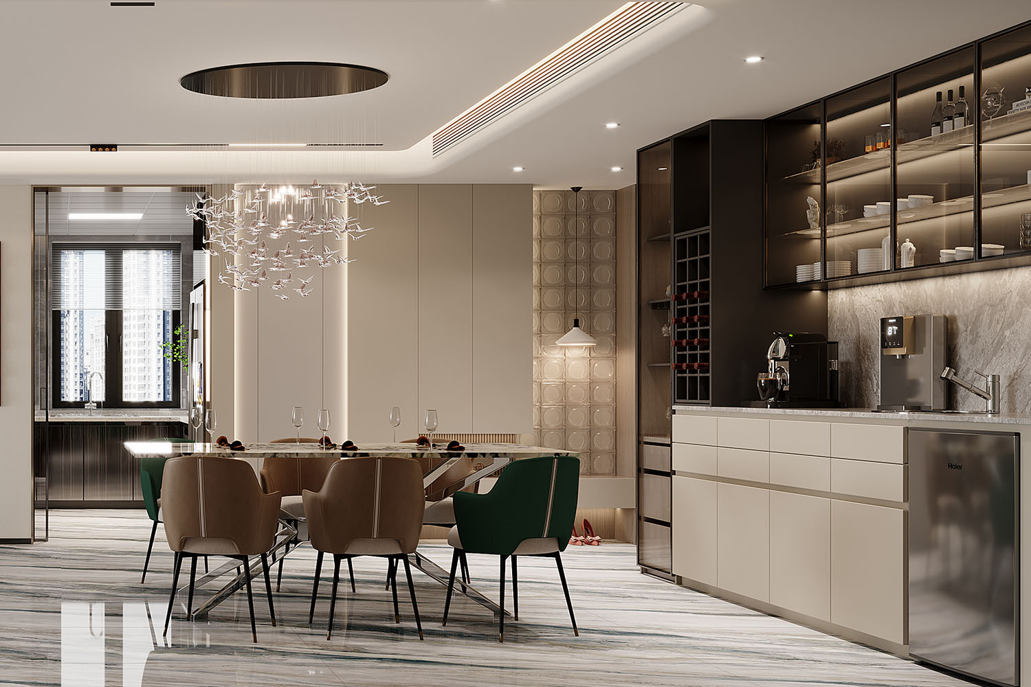 餐廳區域沿用了與客廳空間相同的配色與用材,不同的是設計感十足的吊燈與清新感十足的花鳥掛畫,讓就餐區域多了一抹溫馨靚麗氣息。