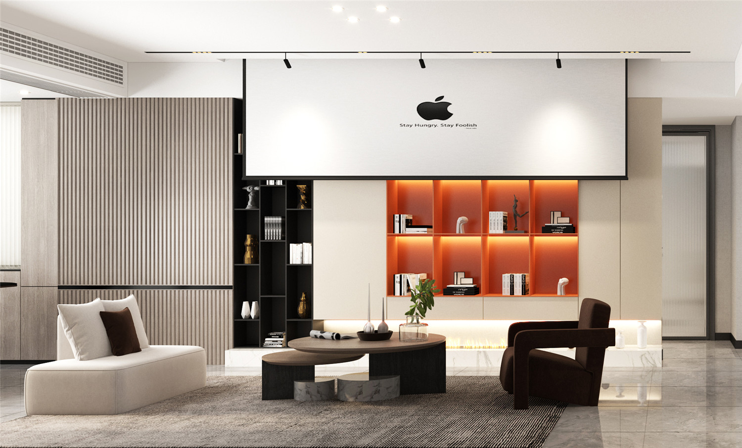 黑色雖然是相對比較常用且百搭的色彩,但是大面積的黑色卻容易造成空間的壓抑。而該空間則是巧妙的利用白色紋理來“化解”黑色所帶來的壓抑感,通過大面積的黑色、沙發來提升空間個性感的同時,利用白色鑲邊處理提升了空間的精致度與清新感。