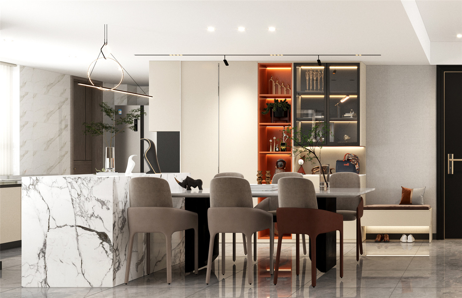 由于房屋需滿足多位家庭成員的起居需求,因此玄關面積可謂是“抓襟見肘”。一個拐角搭配上藝術范十足的掛畫,即可保障空間的私密感與結構感,還不會占用較多的空間面積,一舉兩得。