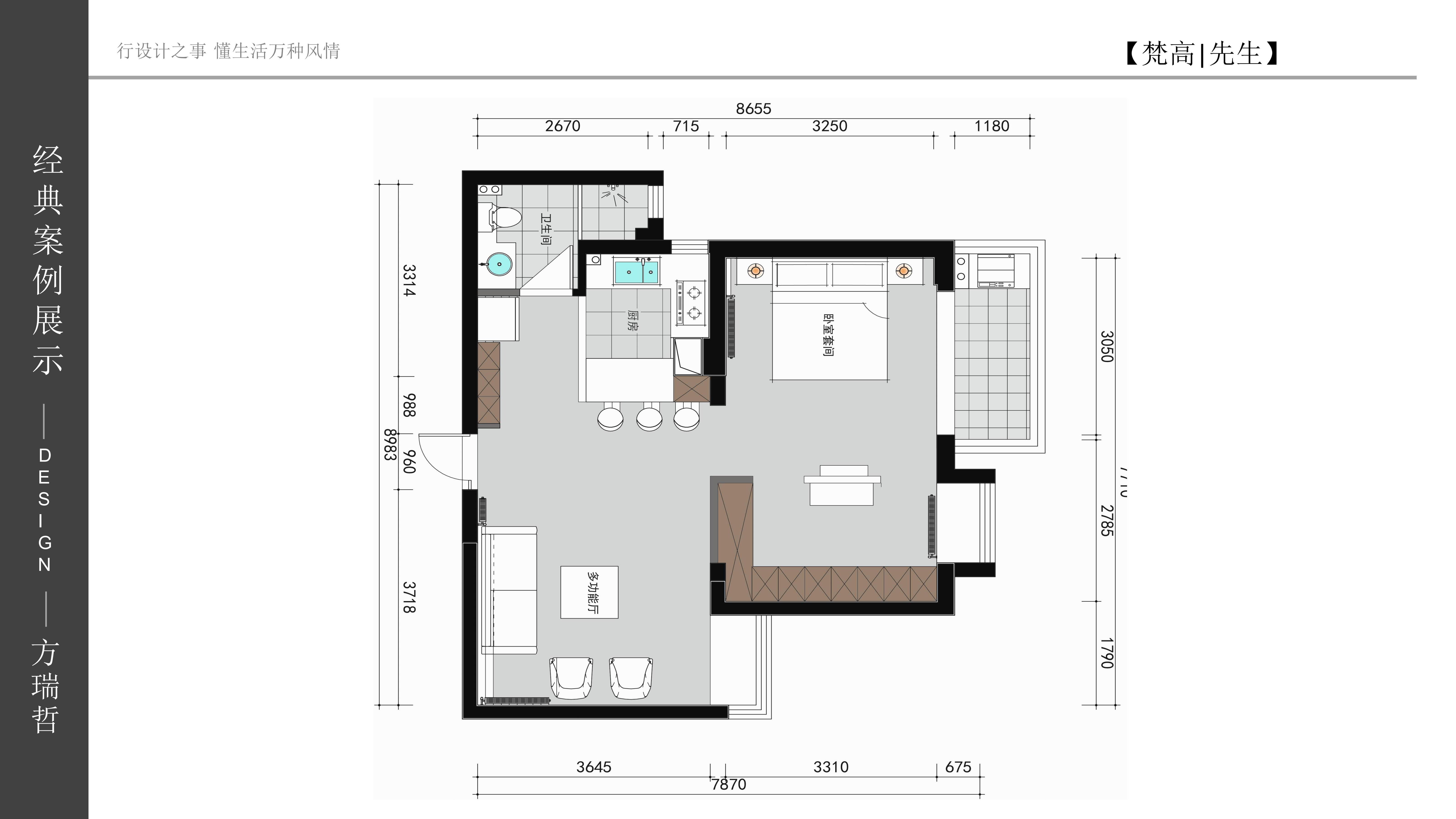 案例簡介:本案例的業(yè)主是一位獨居人士且近期沒有結(jié)婚的打算,因此房屋面積并不大,在與設(shè)計師交流時,業(yè)主明確的提出休憩空間一定要強調(diào)舒適,而整個住宅則要突出自己的個性與品位。設(shè)計師按照業(yè)主的想法將空間打造成半開放式設(shè)計,同時將約一半面積打造成為休憩空間,以滿足業(yè)主日常休憩、辦公需求。休憩空間以外的區(qū)域則打造成廚房與多功能空間,滿足做飯、會客等多種需求。