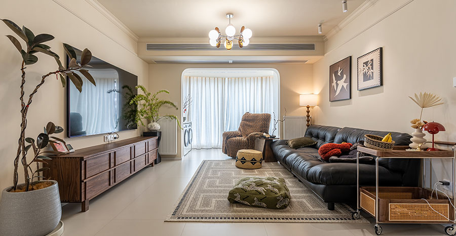 客廳以簡約的淺色系色彩為主基調(diào)色,強調(diào)冷靜沉穩(wěn)的氛圍感,搭配以亮橘色沙發(fā),為空間增添驚艷高級感。