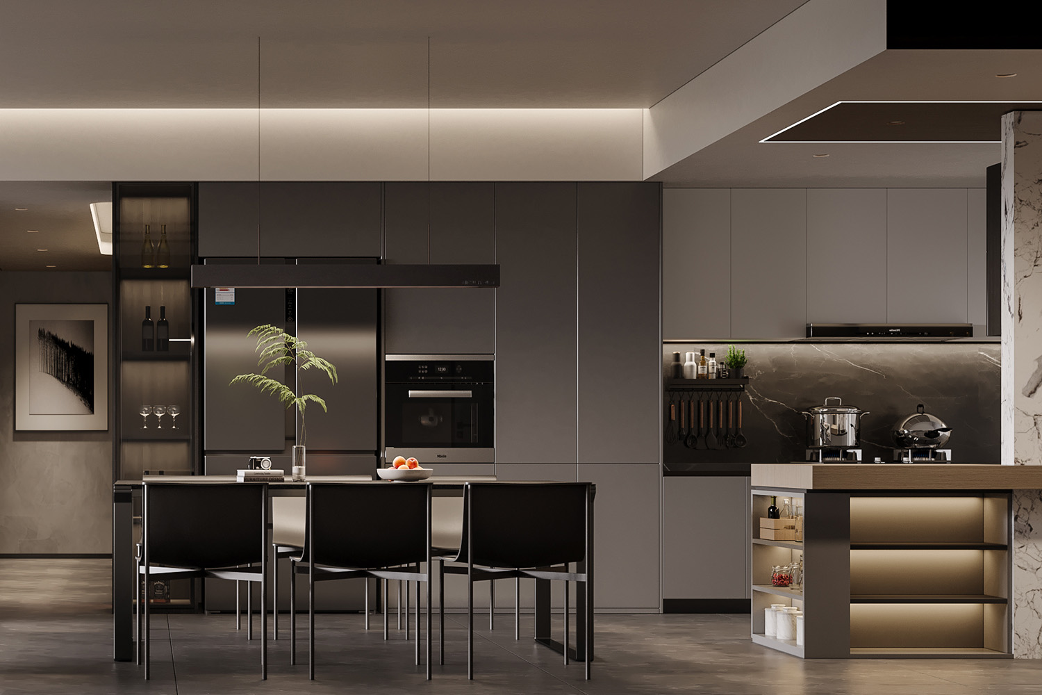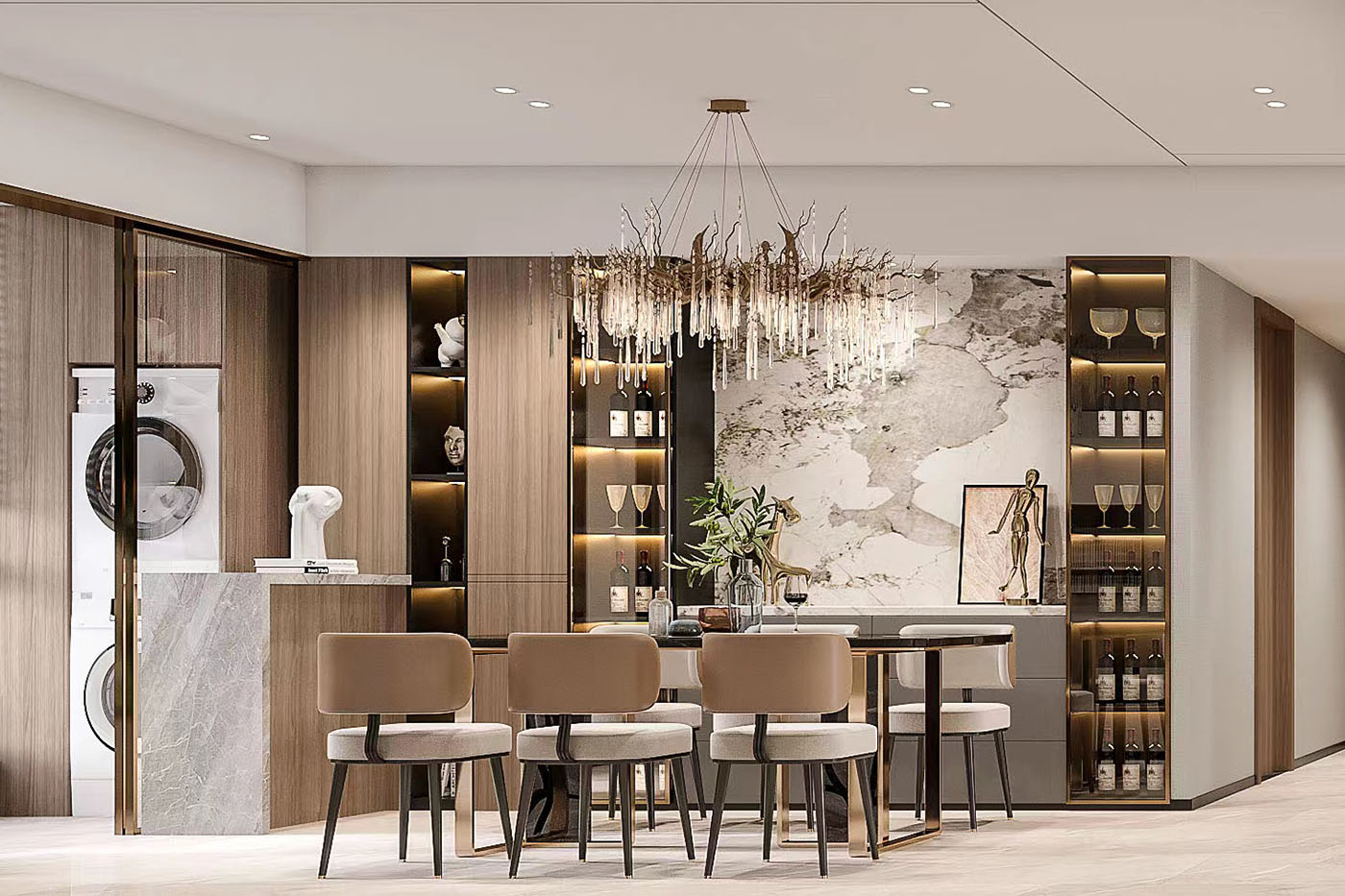 打造餐廳的精致感不需要太過復雜的裝飾,餐邊柜以收納功能為主,添置燈帶裝飾,即可呈現出時尚氛圍,餐桌椅的造型盡量時尚一些,搭配水晶燈具,足以展現出大方氣質。
