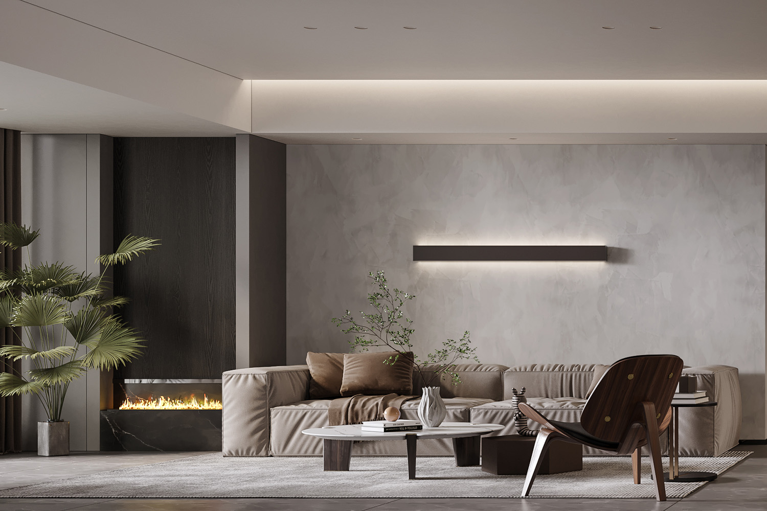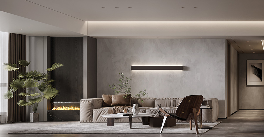 客廳以咖色系為主基調,浪漫的配色帶有女王氣質,簡約的線條中不失輕奢韻味;背景墻一面設計為書柜,一面設計為辦公空間,別有一番風味;灰色絨質沙發與橘色單椅圍合式放置,空間更具設計感,雕塑、擺件、燈具等元素,都令客廳帶有復古的氣息。