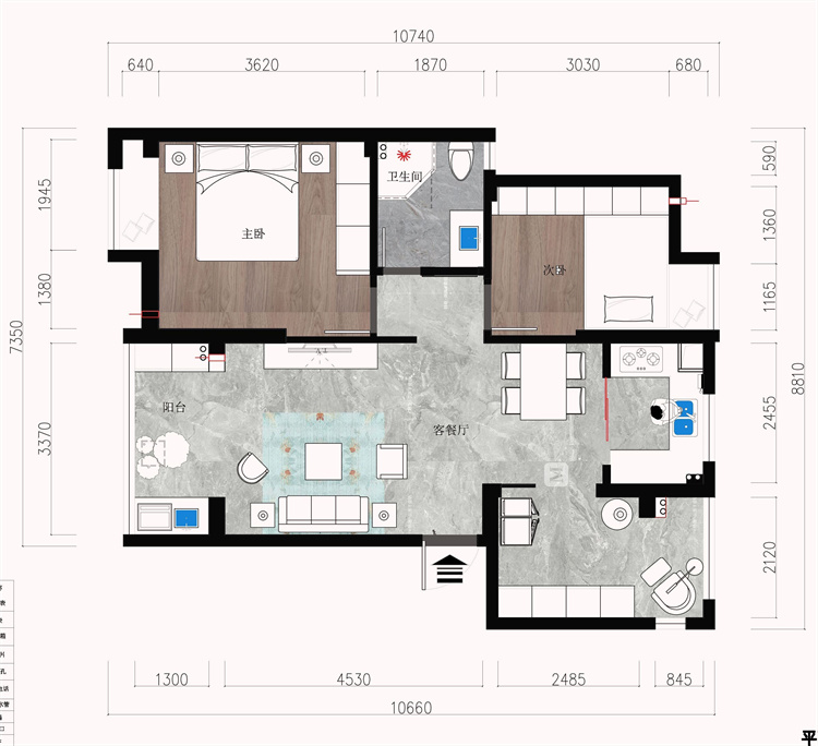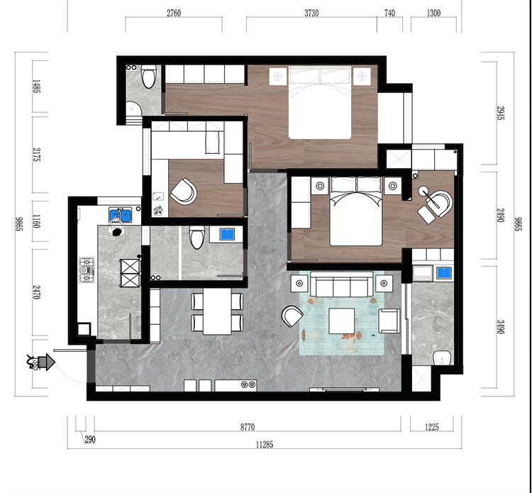 世茂云錦這套三居室的住宅占地面積約為132㎡,整體的戶型結構相對比較規整且南北通透,因此設計師在進行規劃設計時充分發揮了空間由于的結構優勢,將陽臺設計為大落地窗格局,將室外光線更好的引入會客區域,以提升空間的自然感與品質感。為了滿足業主私密性起居使用需求,設計師還在主臥空間中單獨隔離出一個衛浴空間,便于提升主人的生活質感。