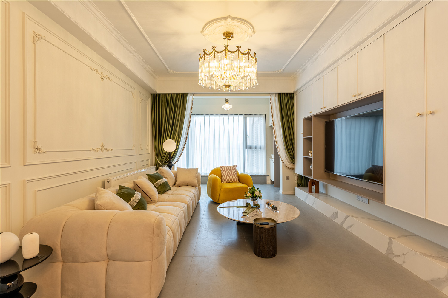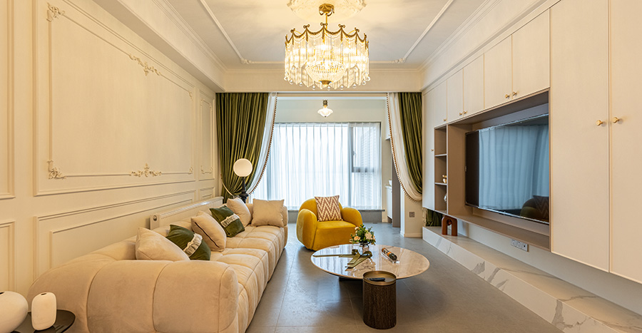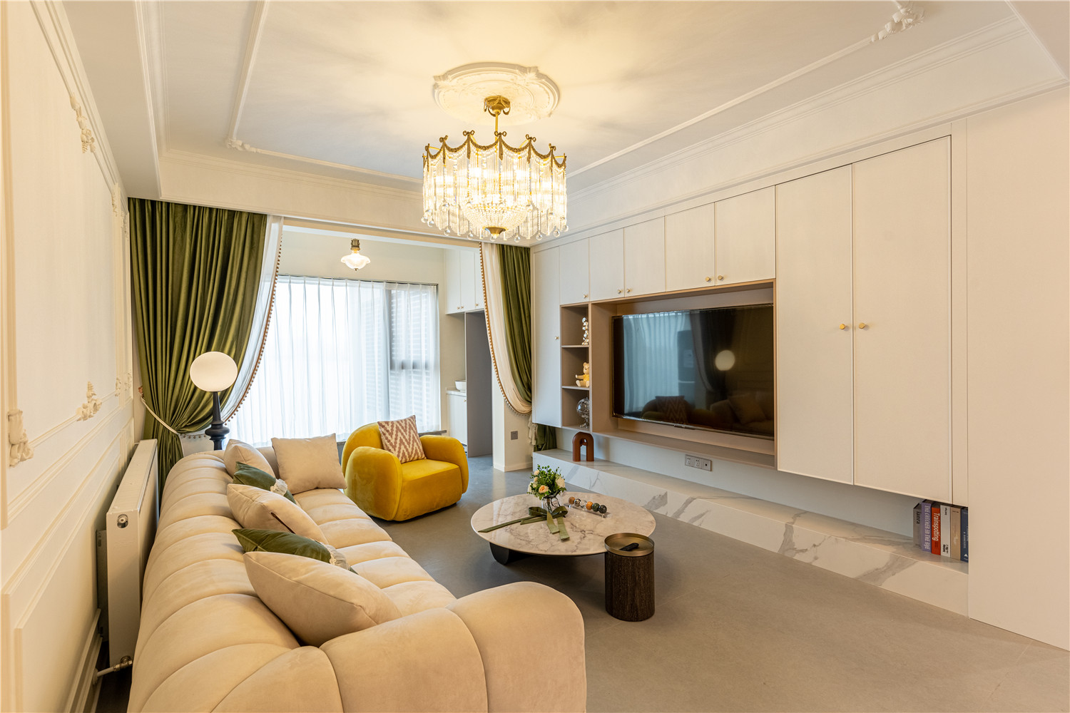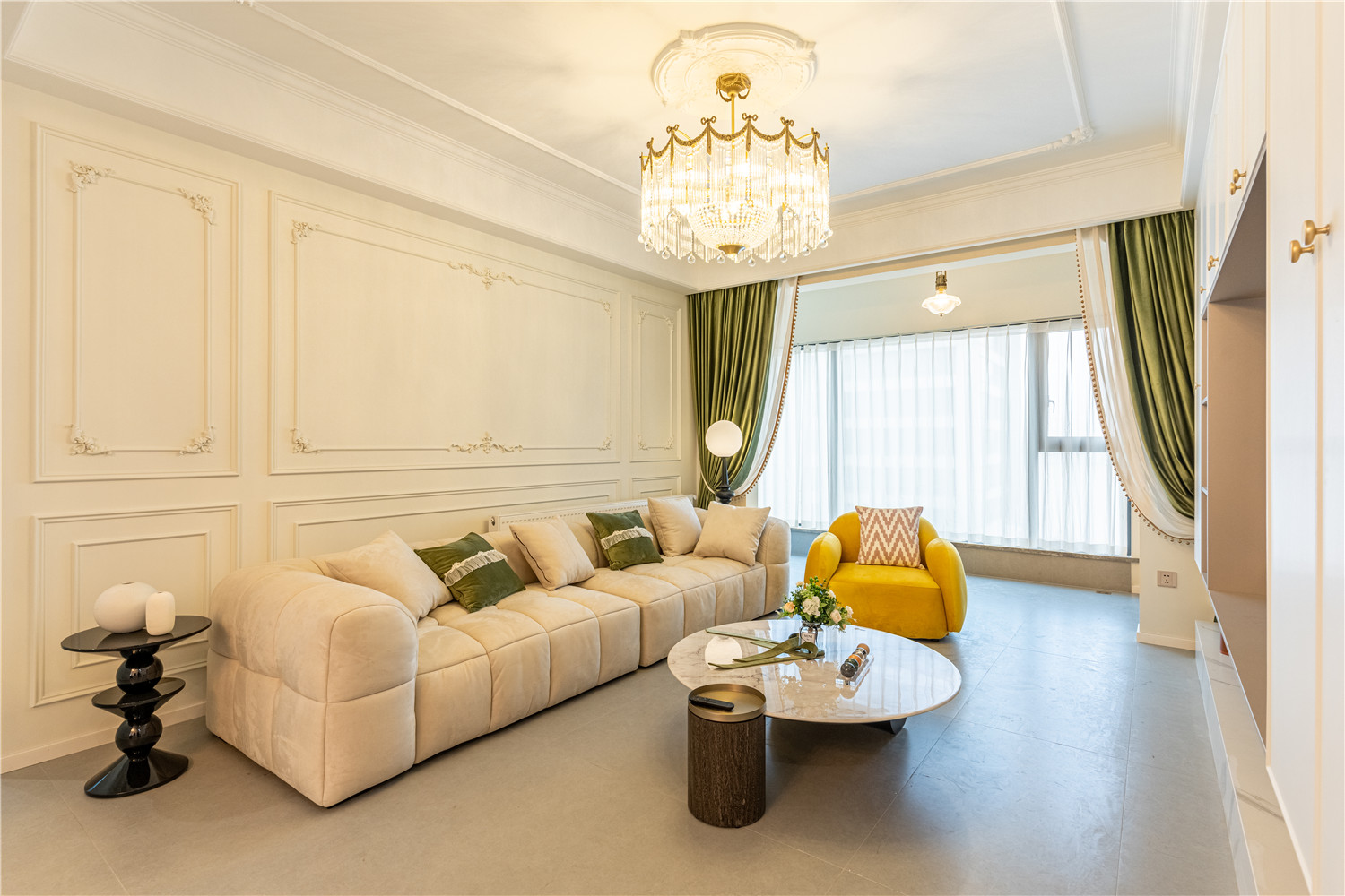大面積的白色背景墻搭配上細節處的線條浮雕處理,低調耐看而又歐亞。亮色沙發則為空間增添跳躍趣味感。