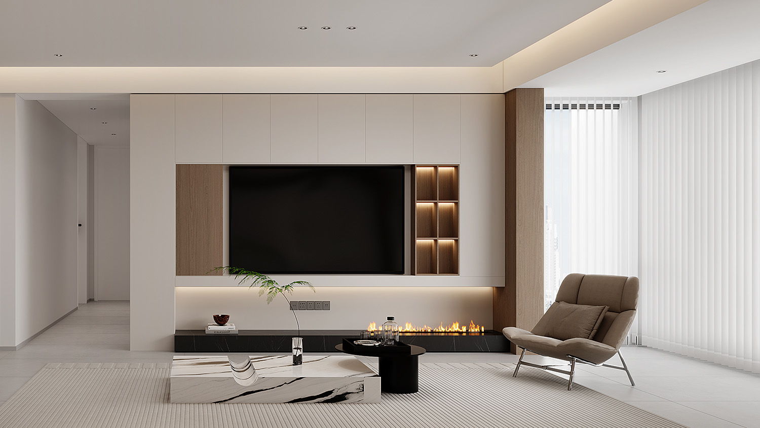 由山水畫構成的電視背景墻典雅又清新,帶有簡單線條處理的灰色地毯則為空間增添時尚摩登氛圍。