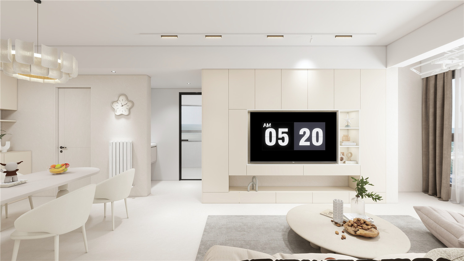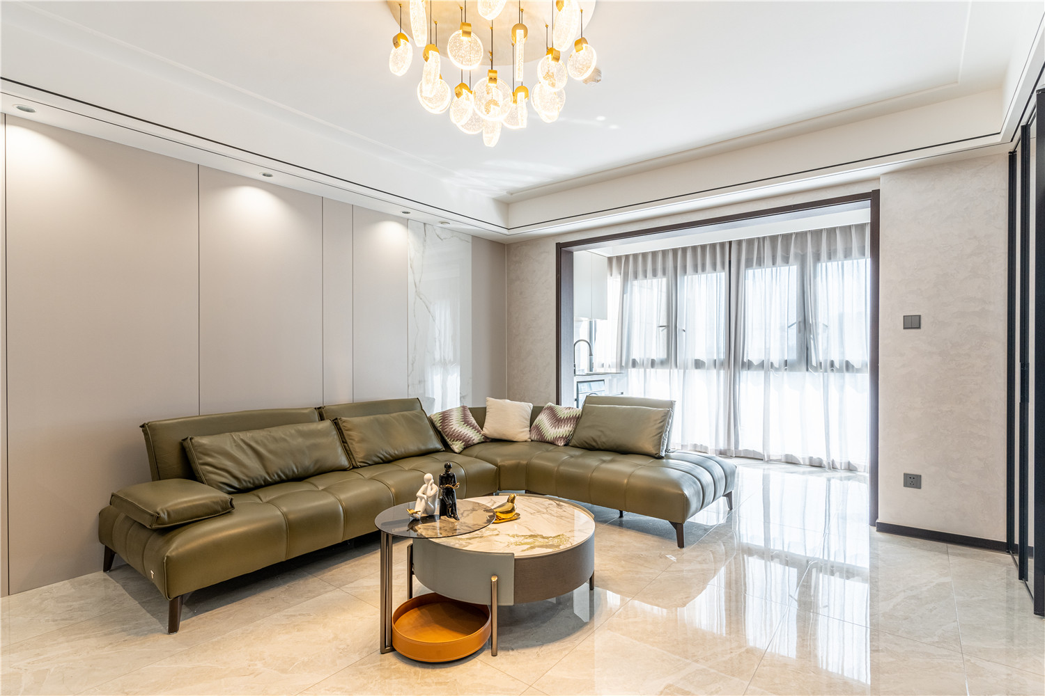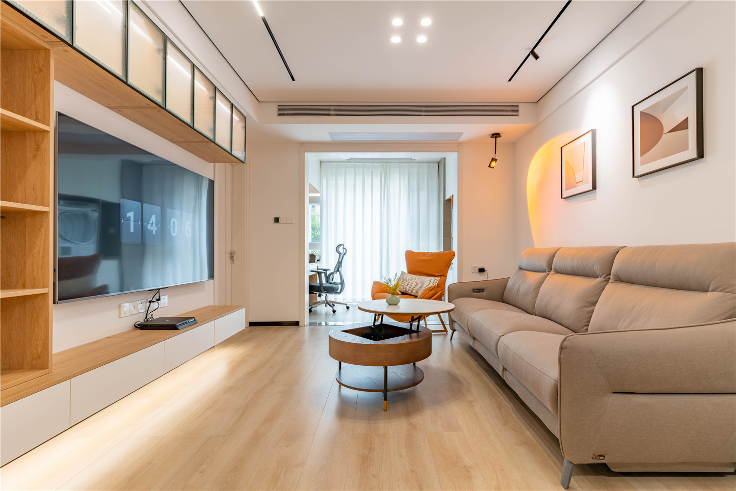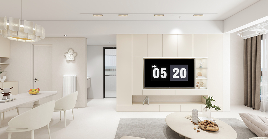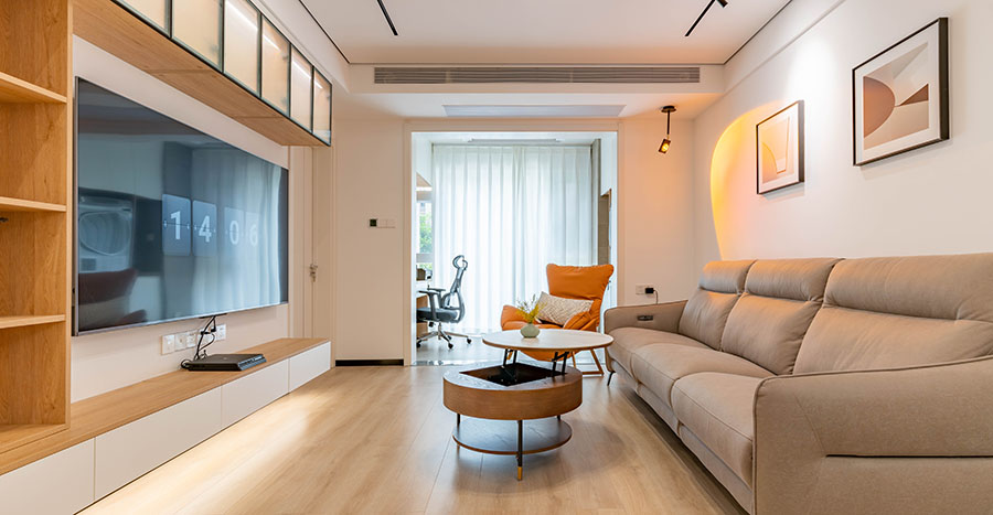 客廳采用新中式天花設計,在線條的勾勒下及中式燈具的點綴下,進一步擴大了客廳的通透感;沙發部分依業主需求,使用了現代白色沙發,搭配木質茶幾、電視地柜及新中式軟裝,令空間顯得更加輕盈。