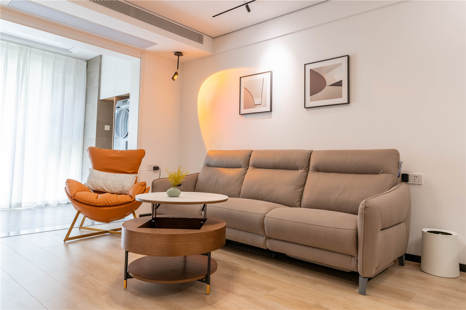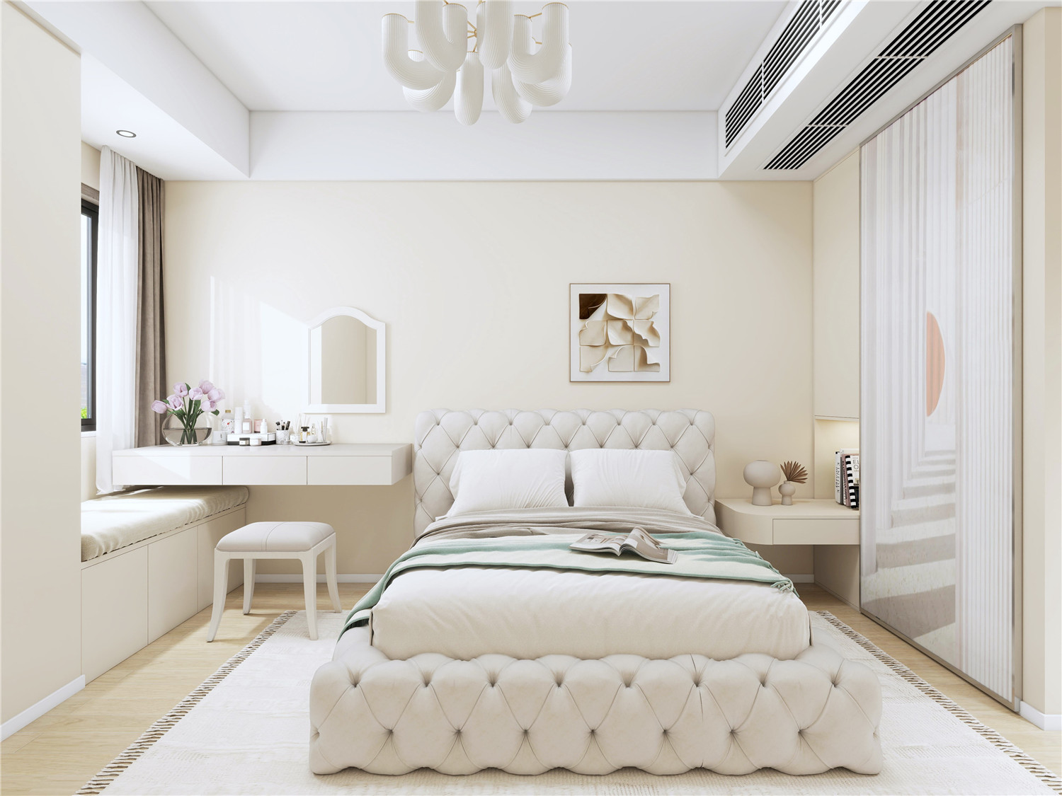 臥室空間需強調寧靜的氛圍感,因此設計師在對臥室區域進行設計的時候使用了光線相對比較柔和的燈具,以強調靜謐感。而床頭處的簡約藝術掛件則讓整個臥室空間多了一抹自然的氣息美。