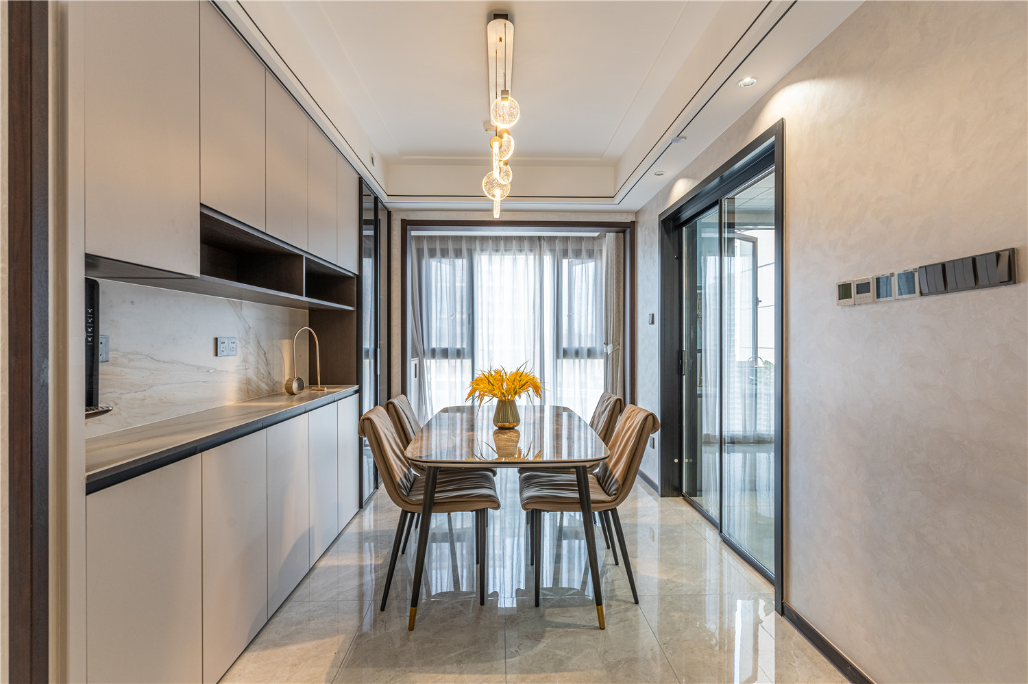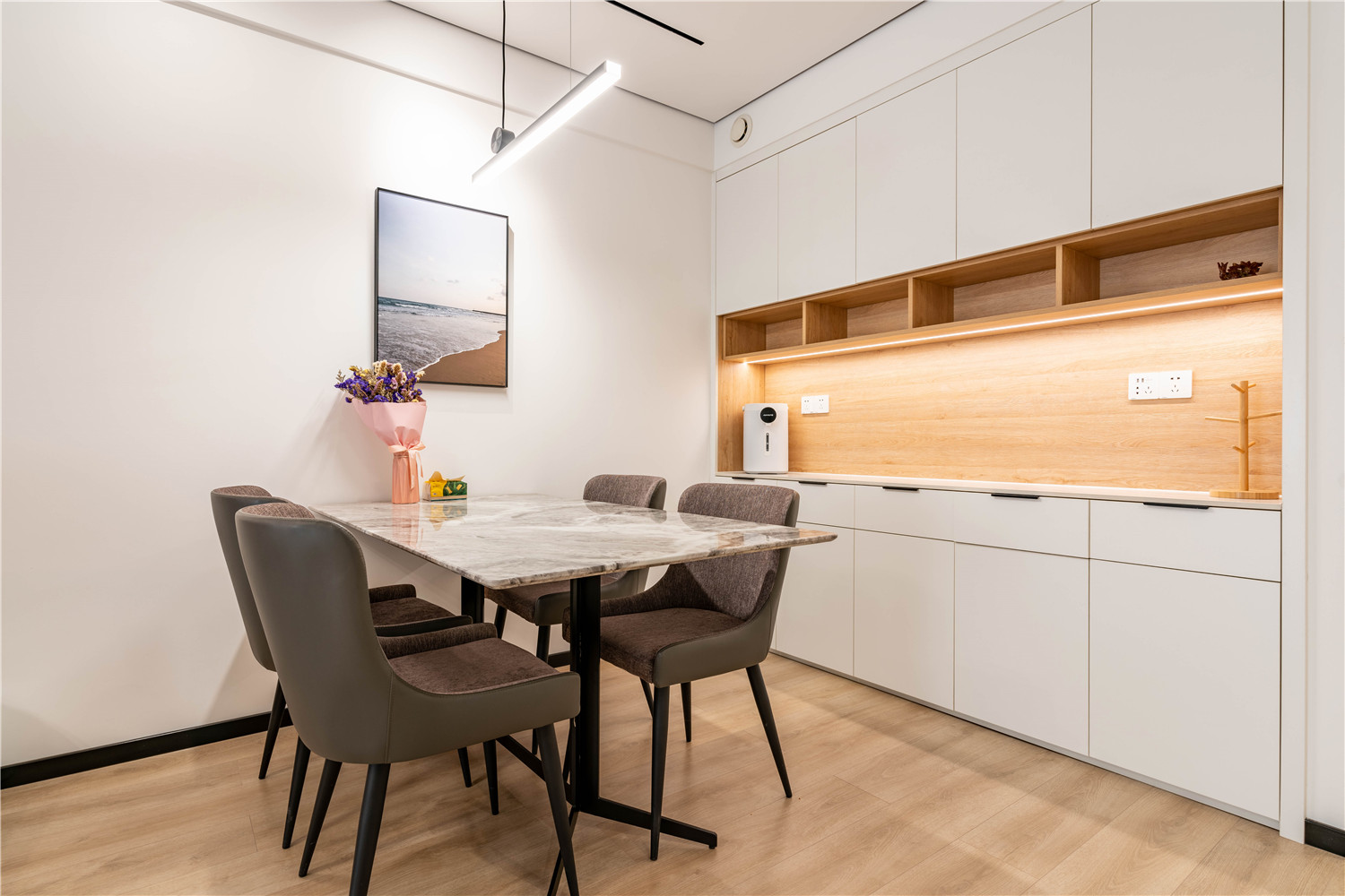 胡桃木家具搭配上造型簡約的吊燈就構成了就餐區域的軟裝,整體造型簡約而又耐看,同時不會占用較多空間。