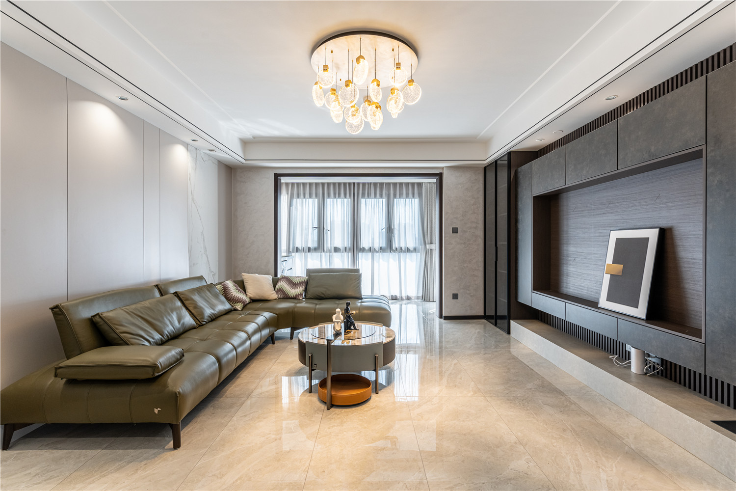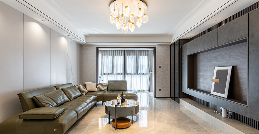 這棟位于瀾橋公館A棟的137㎡四居室住宅戶型南北通透、采光較好,且位于高層,因此設計師在進行規劃設計的時候充分利用了房屋的戶型結構優勢,同時根據業主的需求進行空間的規劃整合,以將房屋呈現出舒適、個性的整體感觀。雖然房屋整體面積不小,但是由于業主家庭成員較多,所需劃分的休憩空間也比較多,因此設計時就需舍棄一些繁瑣的元素,以簡約大氣為主。