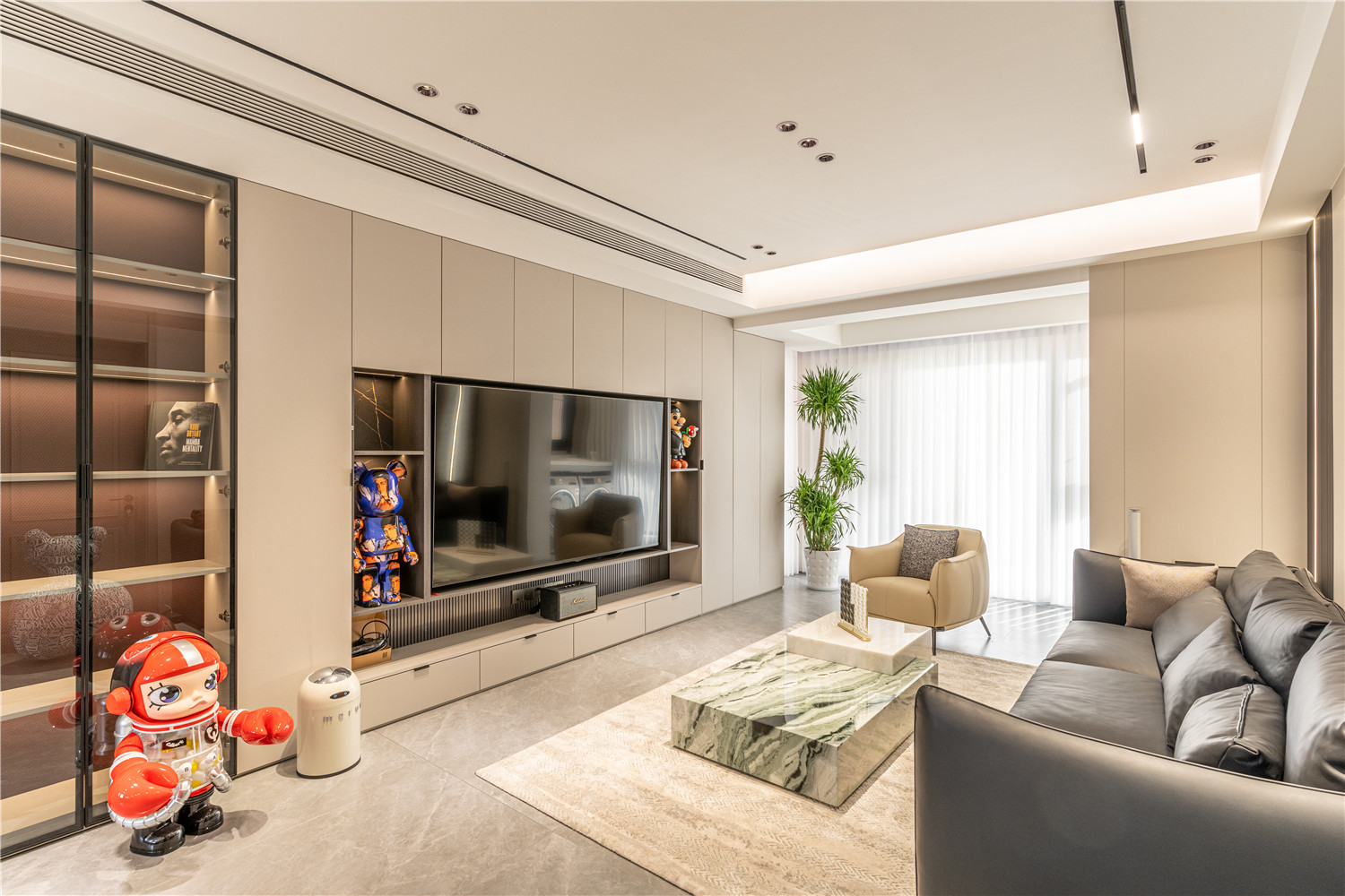 大面積的大理石瓷磚奠定了清冷通透的空間氛圍,搭配以質(zhì)感溫潤的木材,有效提升了空間的視覺平衡感。