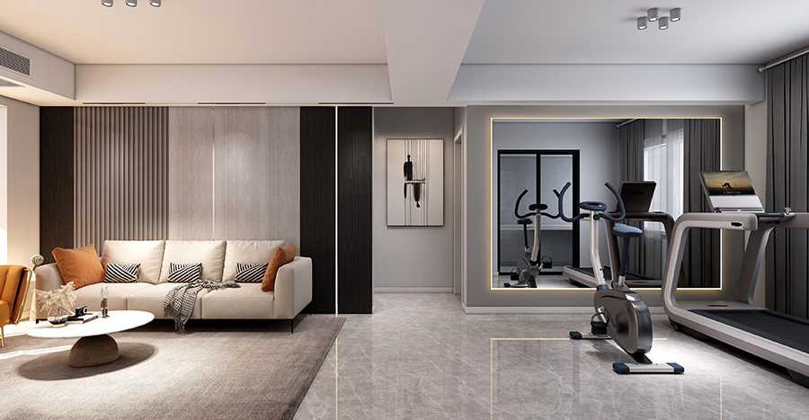 優雅的灰色耐看且耐臟,搭配以簡約的素雅山水畫,讓空間流淌著清新的古韻氣息。大面積的落地窗則讓室外美景一覽無余。