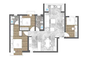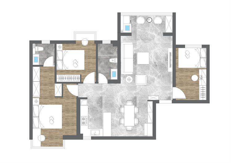江山如畫這套120㎡的三居室住宅原始戶型結構已經進行了基礎的功能分區,不過業主認為原有的功能分區并不能滿足自己與家人日常起居使用需求,因此設計師在原有戶型結構基礎上進行了一定的調整,將入戶拐角區域的小空間改造成次臥,滿足客人起居使用需求。廚房與就餐區域則設計在臥室與客廳的銜接空白處,同時通過軟隔斷進行空間分隔,以提升空間的利用率。
