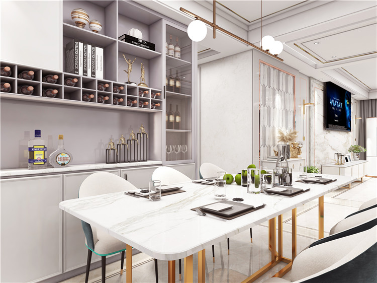 就餐區域沿用與客廳一致的白色及鑲邊處理,強調空間和諧感。墻面區域的簡單藝術擺件現代時尚氣息濃厚,為空間增添摩登色彩。