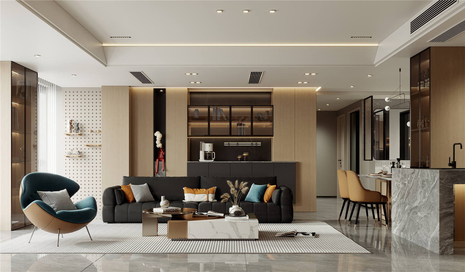 與墻面融為一體的嵌入式儲(chǔ)物架設(shè)計(jì)藝術(shù)感十足而又不失功能實(shí)用性。