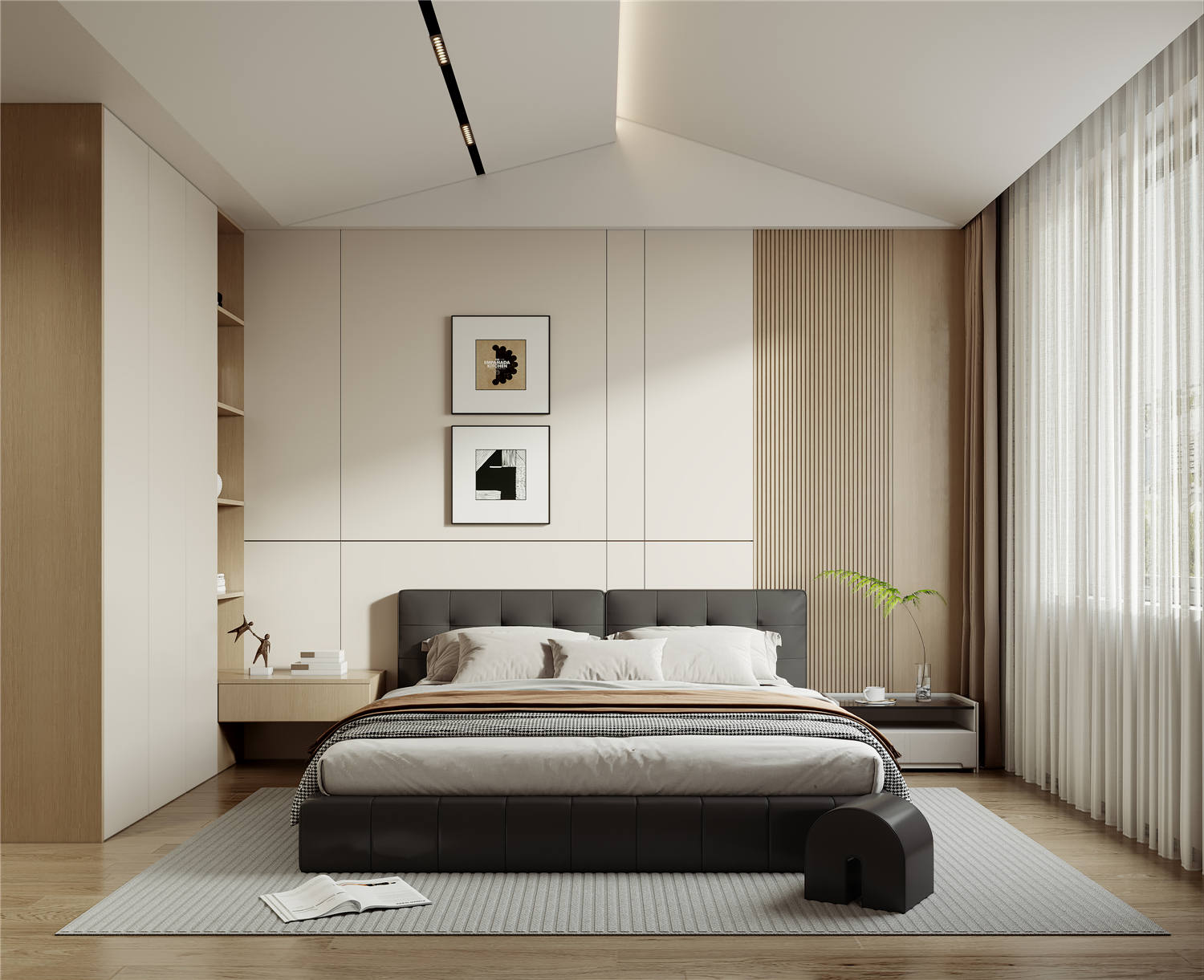 照片墻面簡(jiǎn)約耐看又清新,懸空式的儲(chǔ)物柜設(shè)計(jì)感十足,藍(lán)色窗簾則為空間增添明快自然氣息。