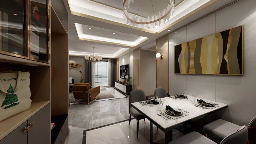 這套位于綠地金融國際城的四居室房屋面積雖然在220㎡左右,但是由于戶型并不方正平整,且存在著零碎角落,因此存在著較大的設計難題。為了讓所有的空間都得到合理的充分利用,化解戶型缺陷,設計師對空間進行了再規劃,將入戶處左邊的狹長條區域打造成廚房,利用戶型的轉折減少油煙進入生活空間的概率。同時將該區域進行一定的再切割,規劃出一塊置物空間,有效提升了家居空間的利用率。