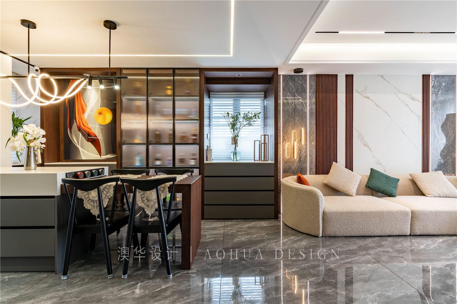 君薈天地的這套四居室房屋的面積約為140㎡,整體結構相對平整,幾乎不存在各種零碎角落,因此設計師在進行規劃設計時無需對功能空間進行重新劃分。而由于業主偏愛通透開闊的視覺感,因此在進行廚房設計時選用了開放式設計,同時將就餐區域融入廚房中,有效提升了區域的面積利用率。