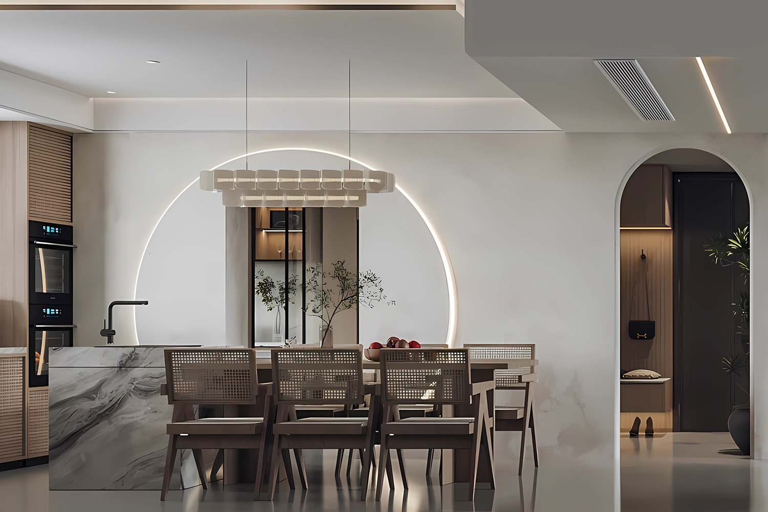 餐廳其實是將廚房臺面延伸出來的角落進行再規劃設計,同時借助藝術感燈飾進行點綴,實用且耐看。